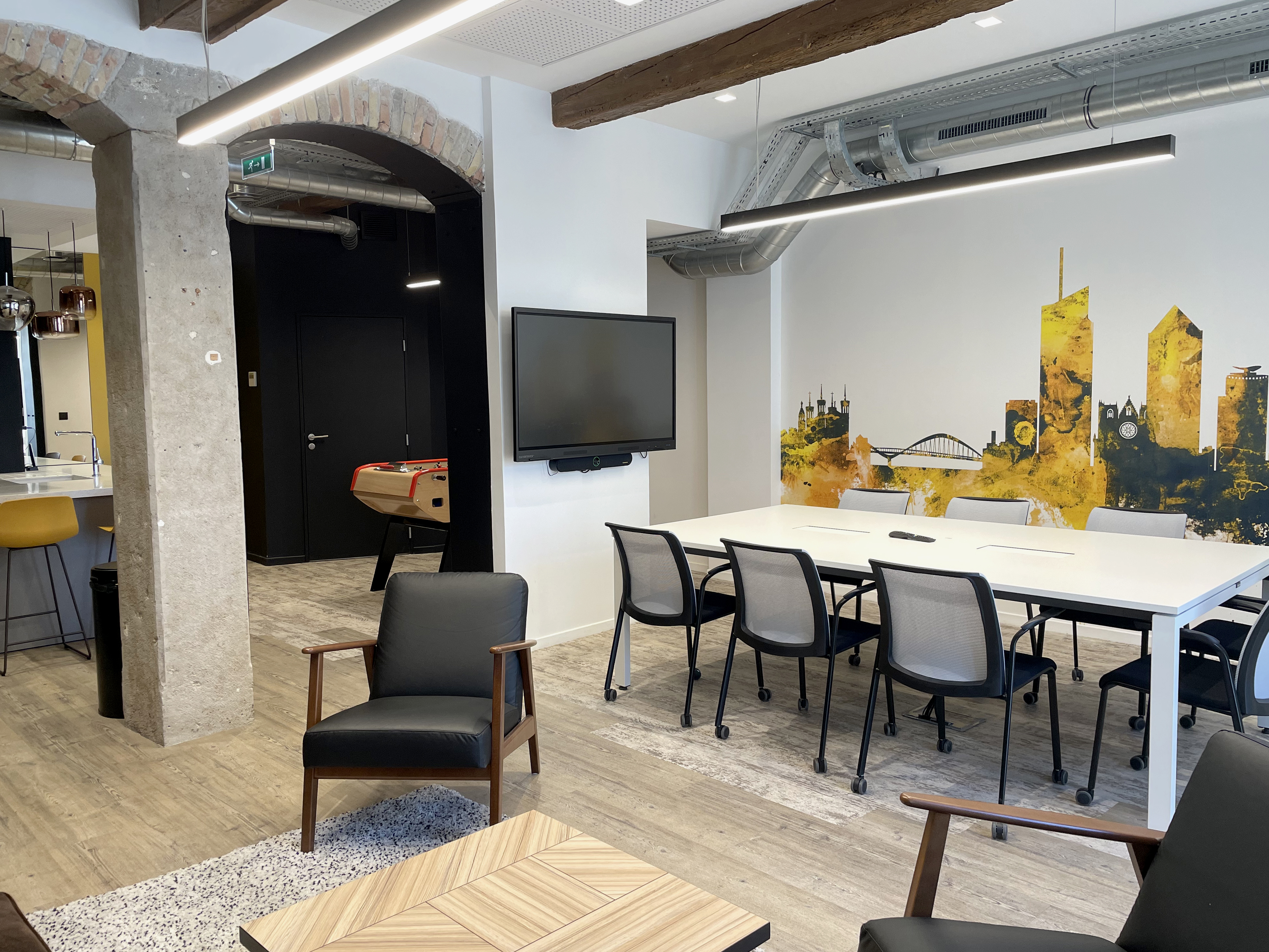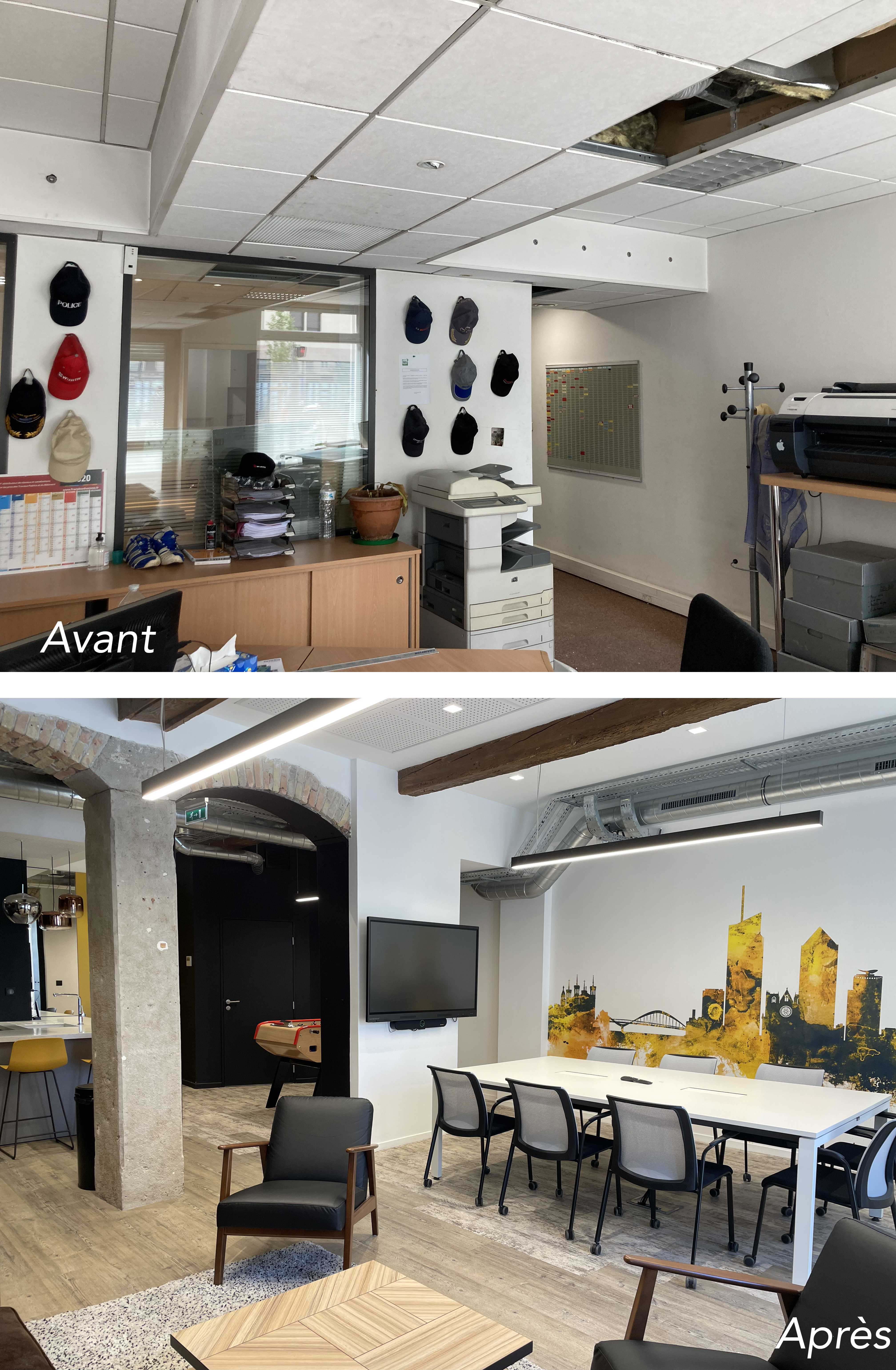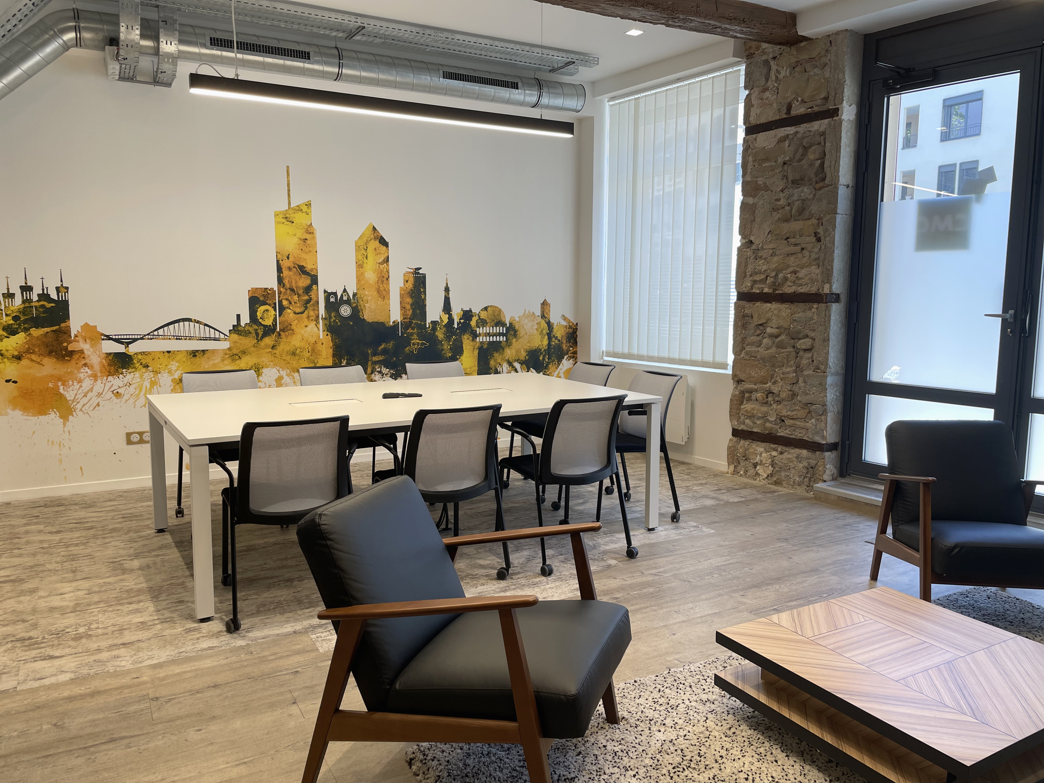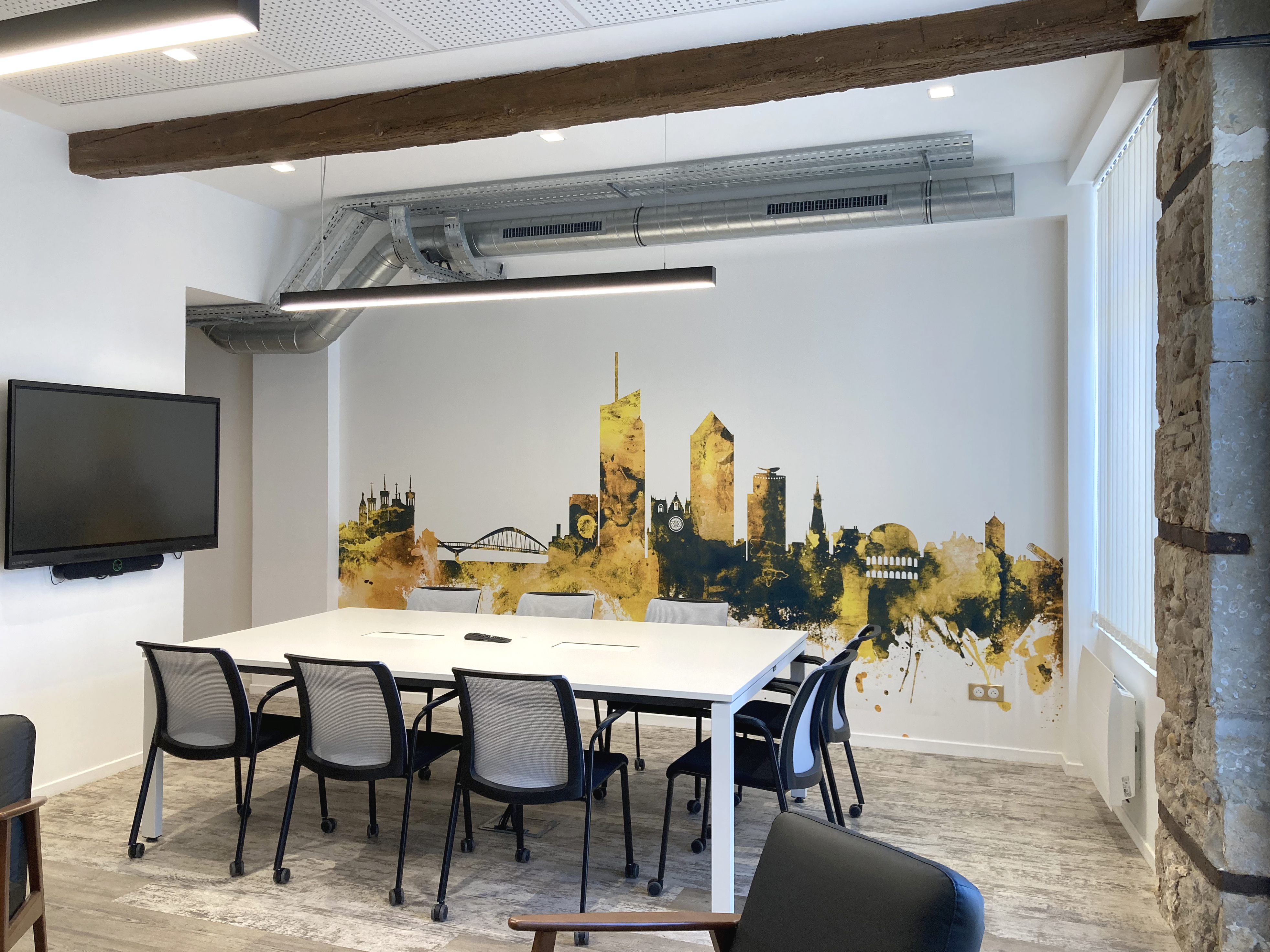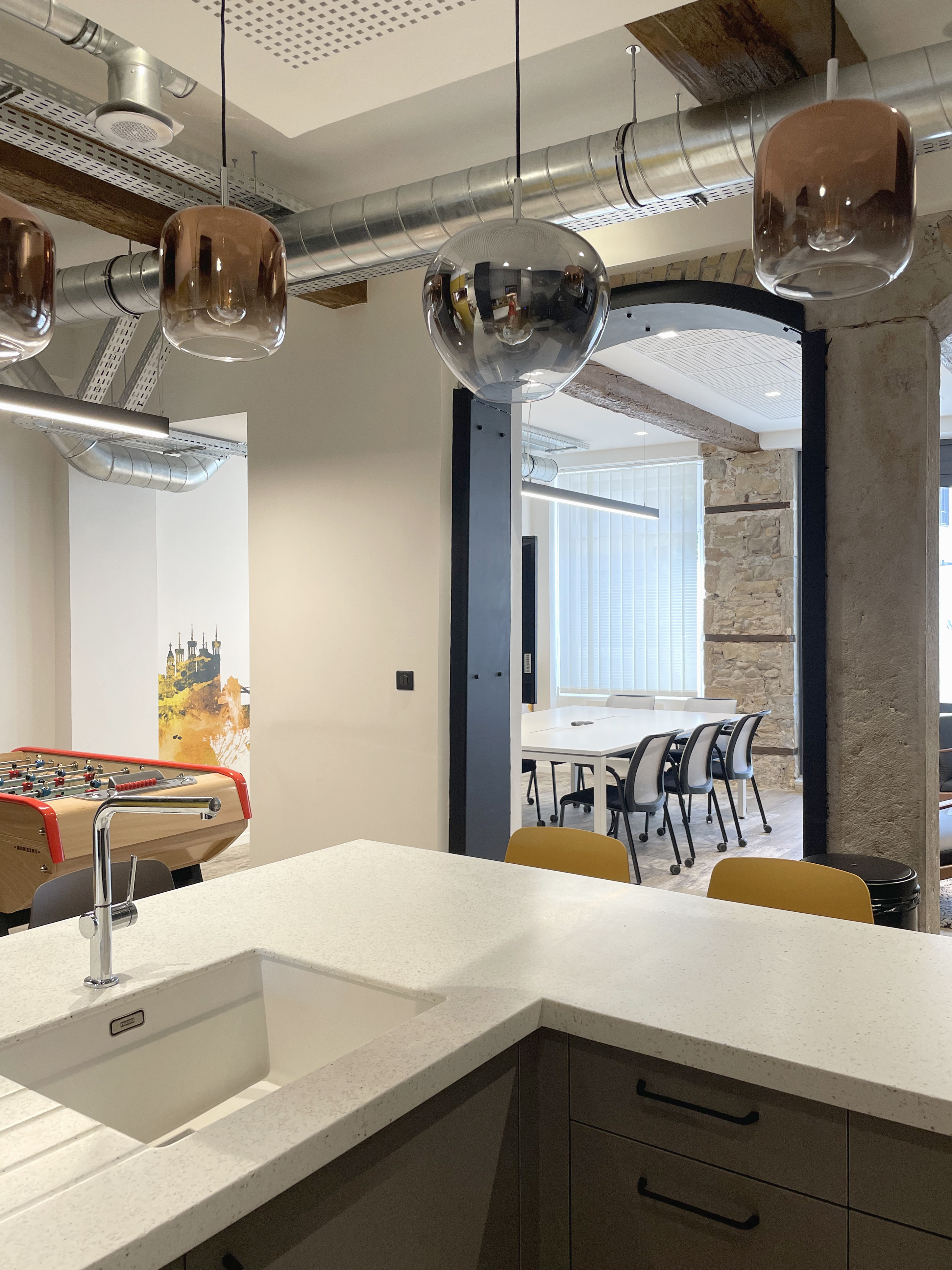 Ce projet pour l’entreprise CMC combine élégance et fonctionnalité pour créer un lieu de réception unique. Nous avons sublimé le caractère du local en mettant en valeur les murs en pierres et les linteaux existants découverts lors de la démolition. Les volumes ont été ouverts pour offrir une cuisine moderne et accueillante, un espace de réunion baigné de lumière, une zone de jeux dynamique et un coin détente avec canapé. La skyline Lyonnaise revisitée sur un papier peint original, insuffle énergie et modernité à cet espace, favorisant la convivialité et le partage.