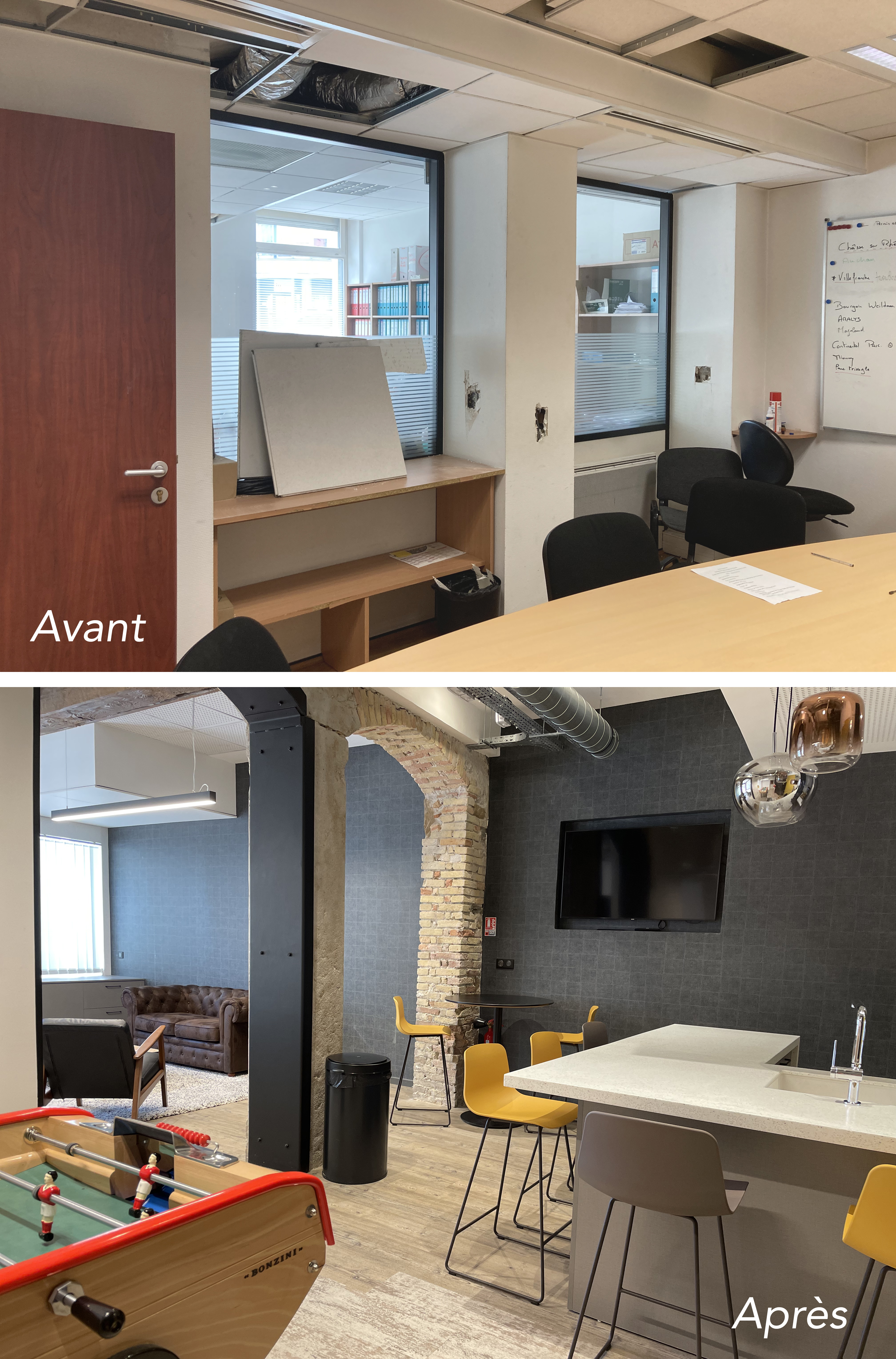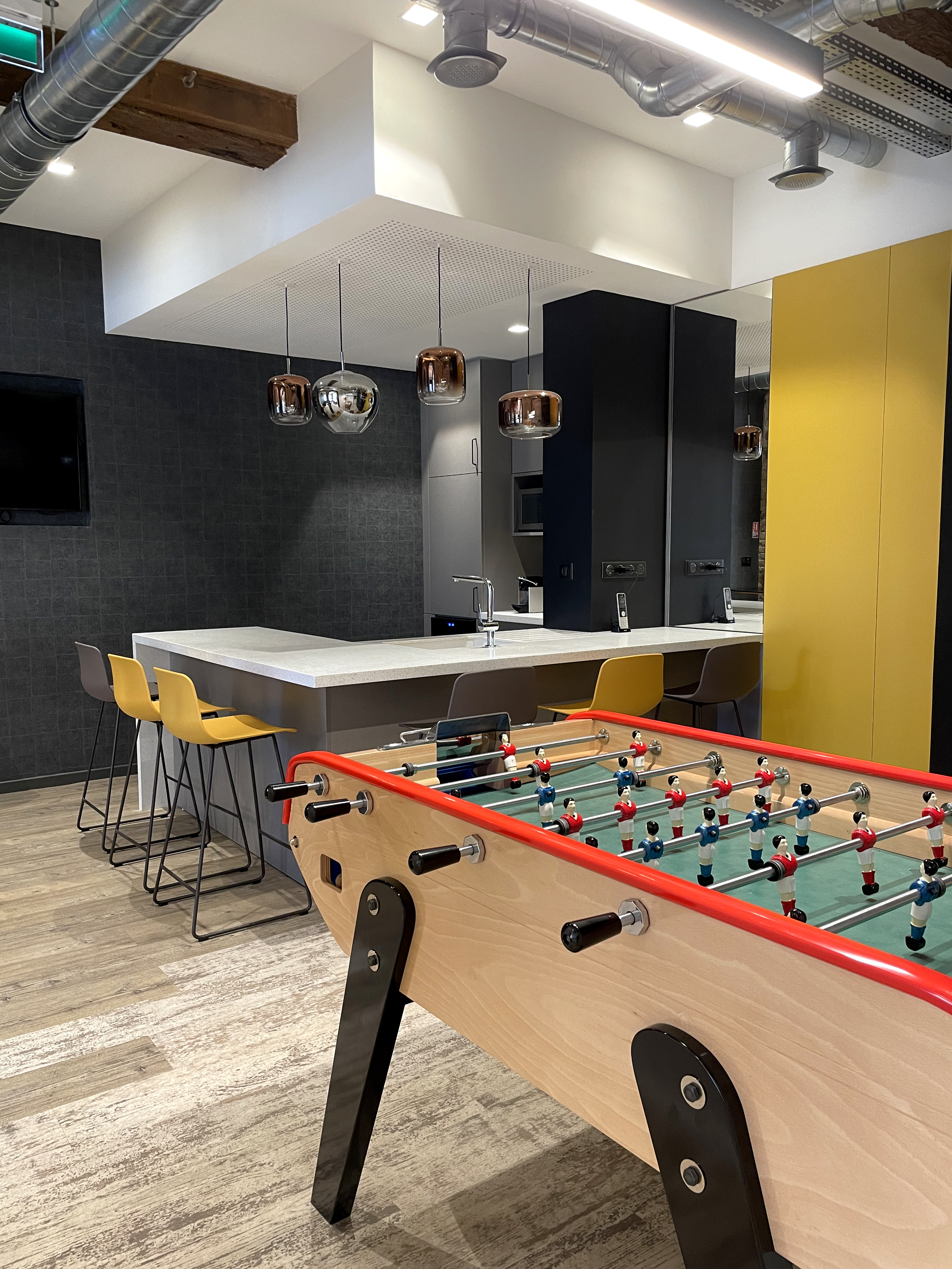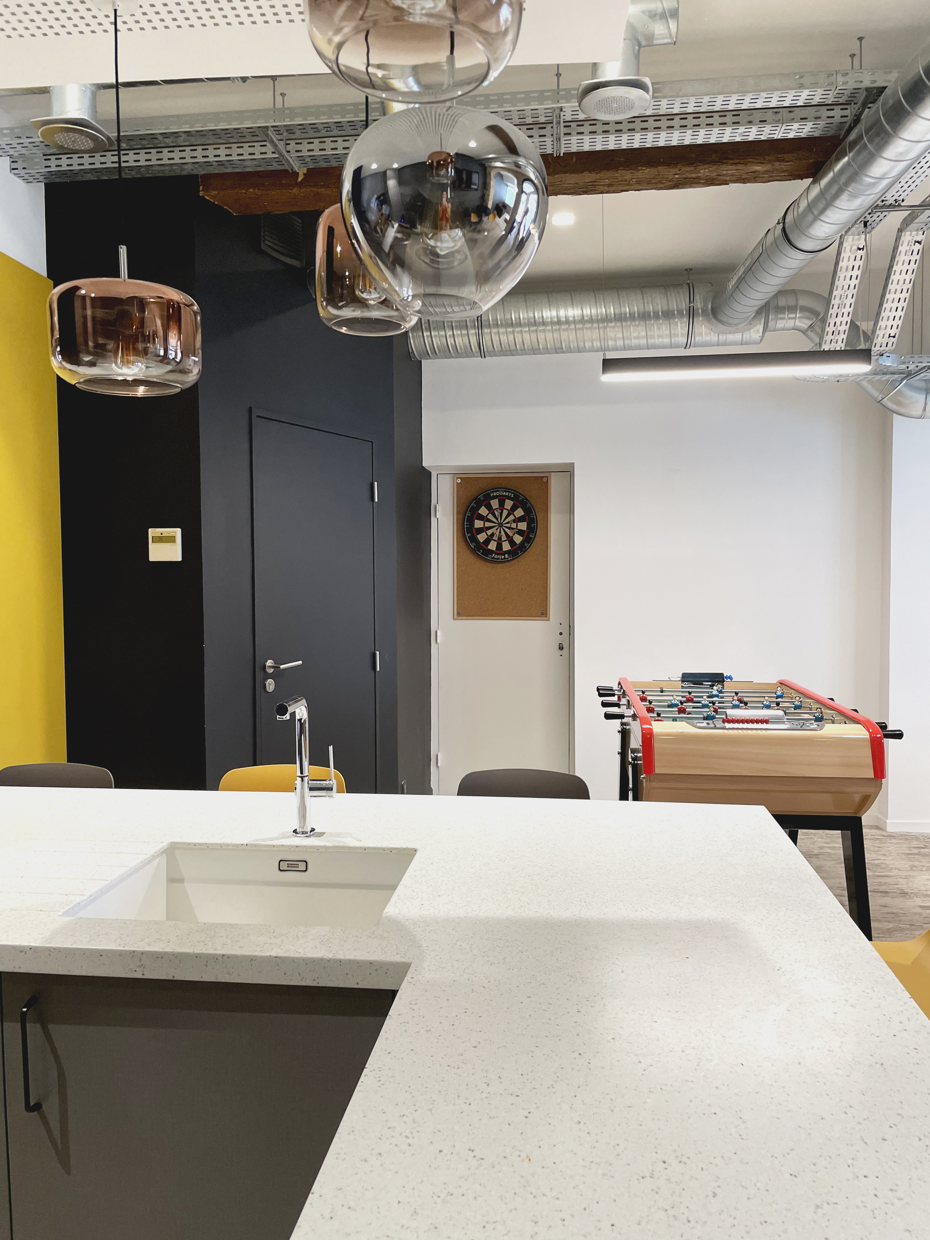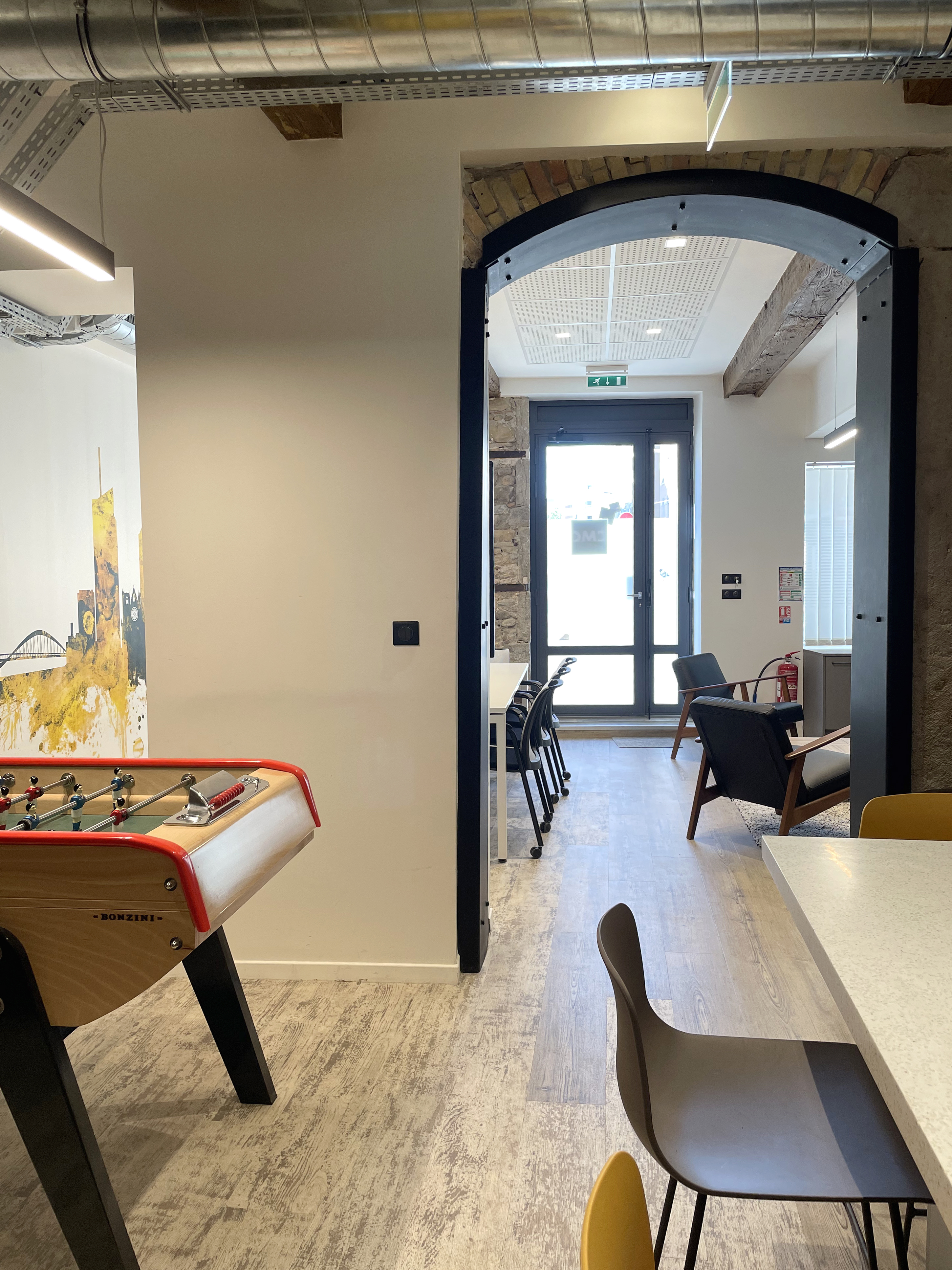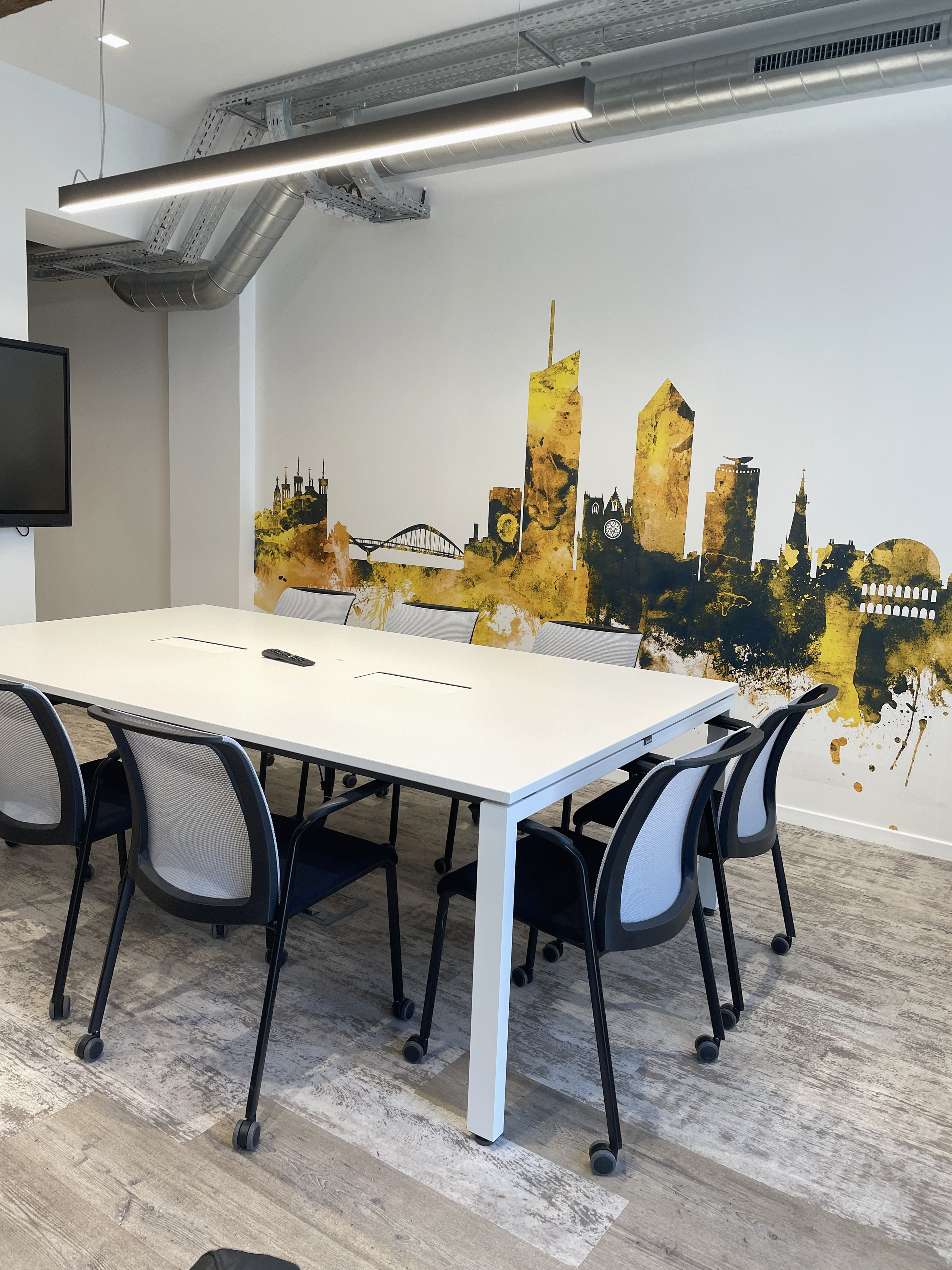 Ce projet pour l’entreprise CMC combine élégance et fonctionnalité pour créer un lieu de réception unique. Nous avons sublimé le caractère du local en mettant en valeur les murs en pierres et les linteaux existants découverts lors de la démolition. Les volumes ont été ouverts pour offrir une cuisine moderne et accueillante, un espace de réunion baigné de lumière, une zone de jeux dynamique et un coin détente avec canapé. La skyline Lyonnaise revisitée sur un papier peint original, insuffle énergie et modernité à cet espace, favorisant la convivialité et le partage.