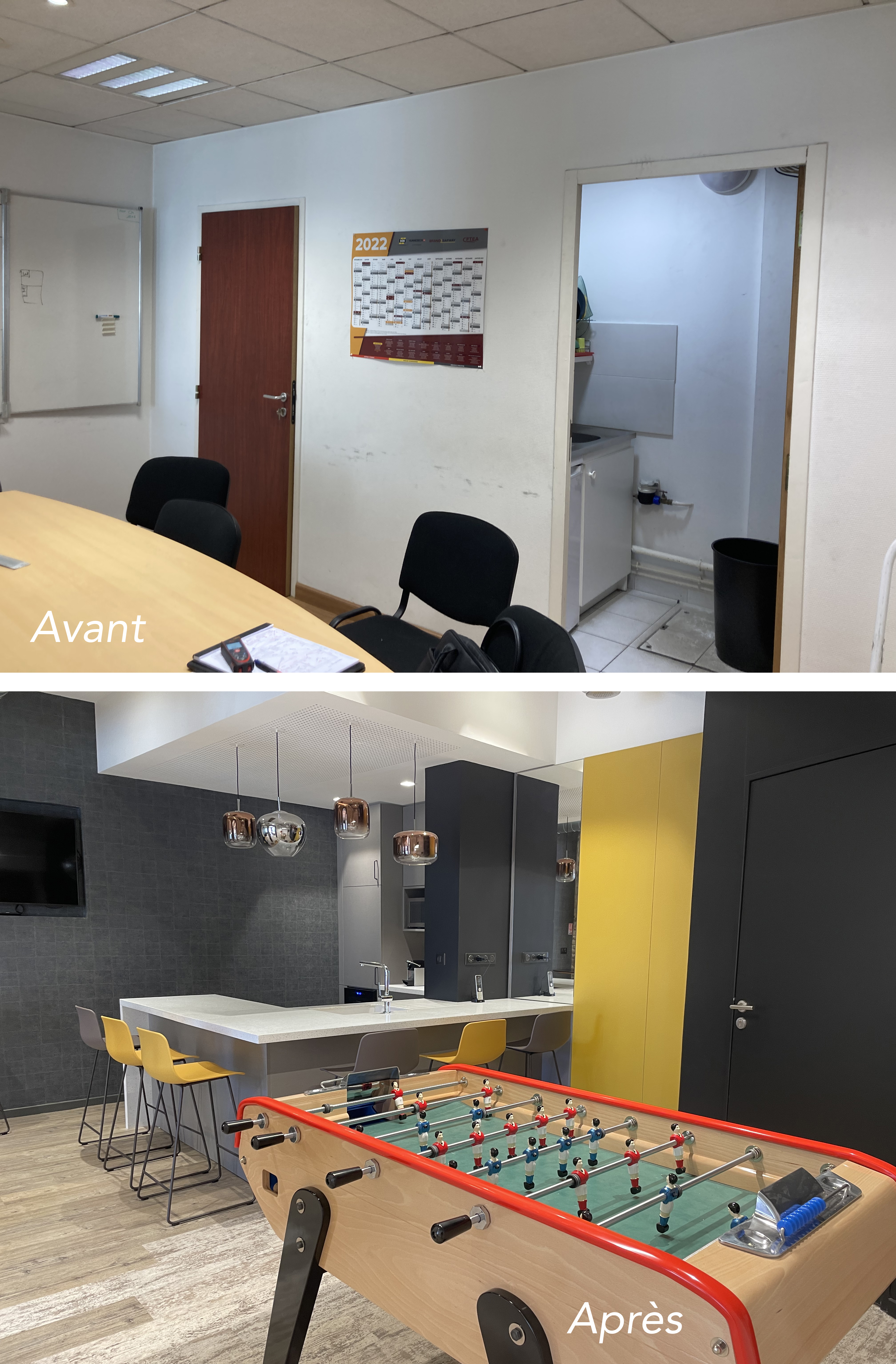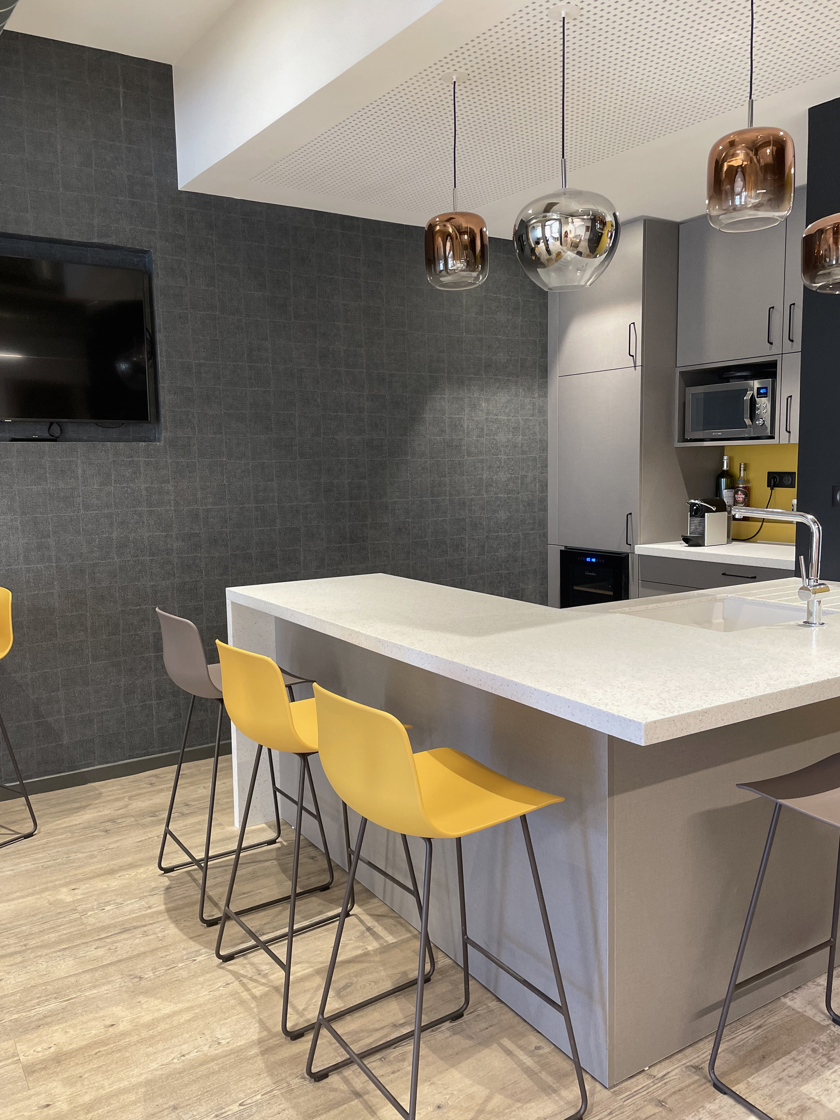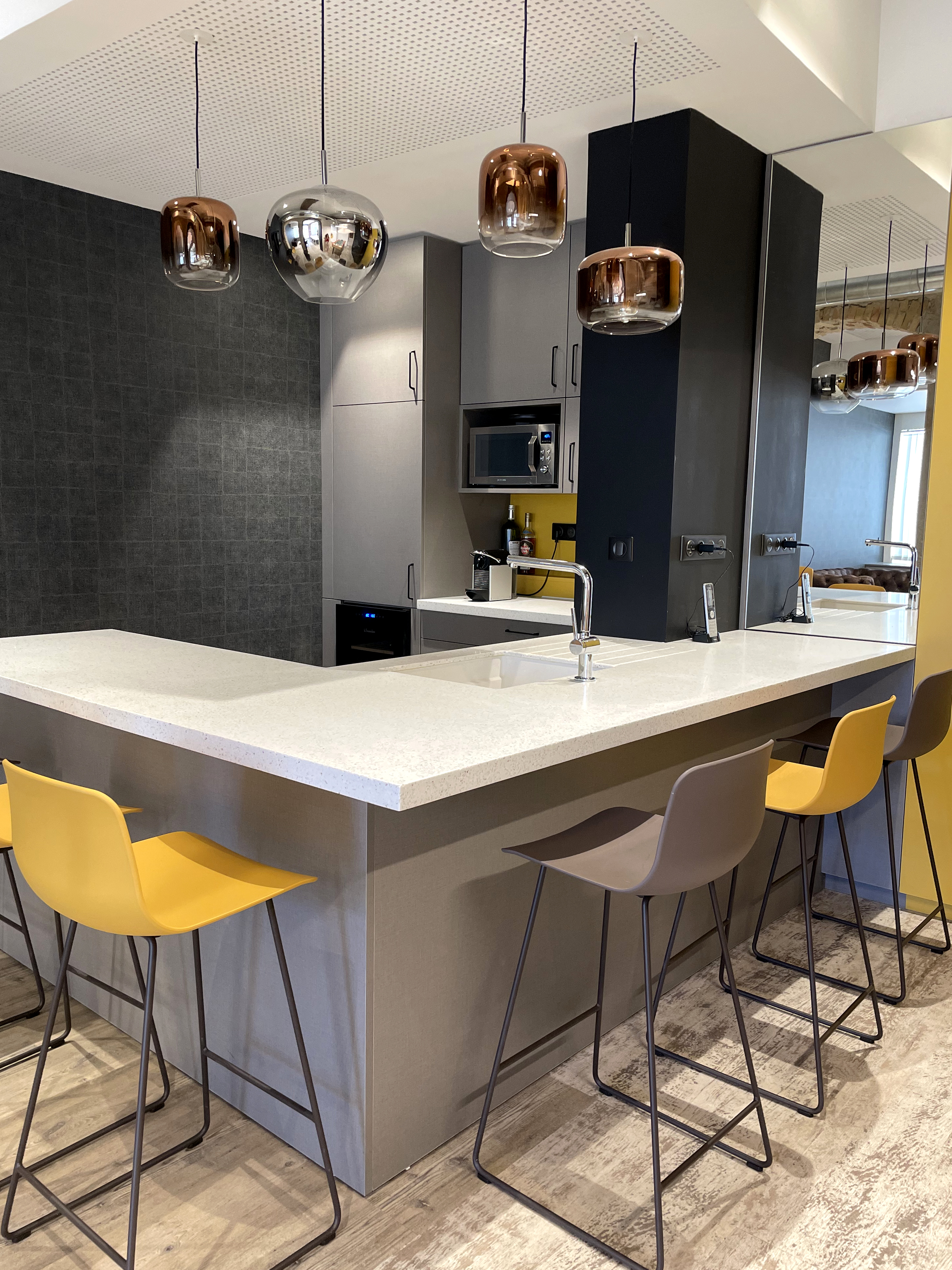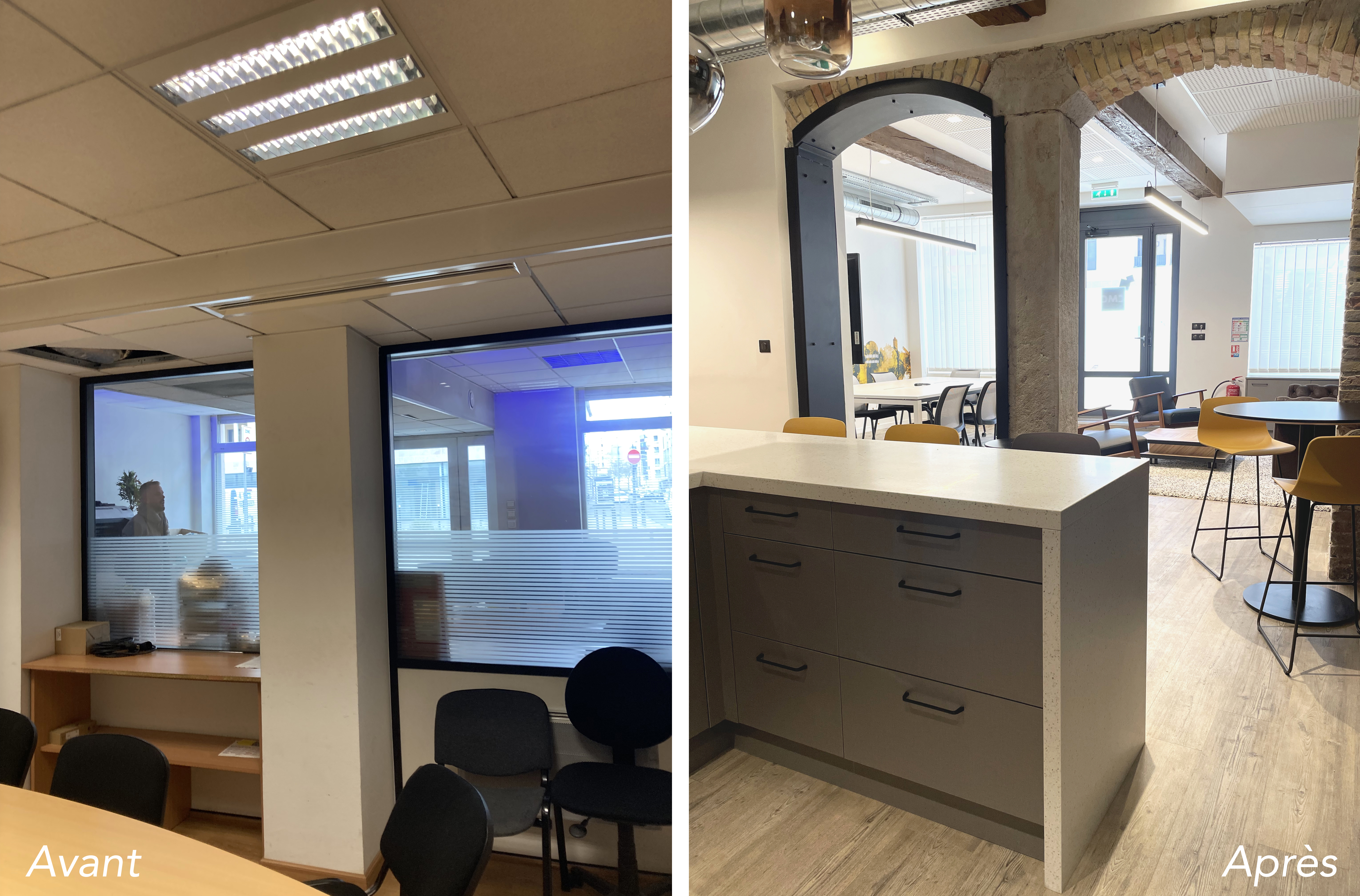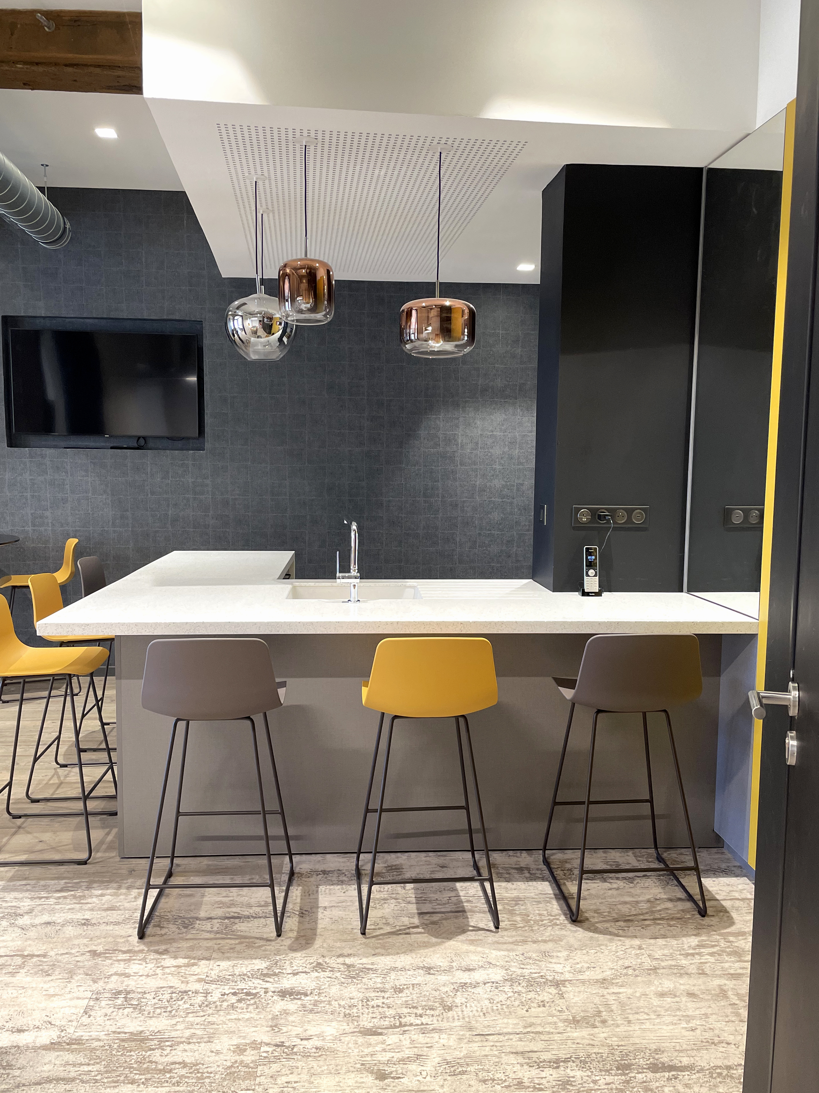 Ce projet pour l’entreprise CMC combine élégance et fonctionnalité pour créer un lieu de réception unique. Nous avons sublimé le caractère du local en mettant en valeur les murs en pierres et les linteaux existants découverts lors de la démolition. Les volumes ont été ouverts pour offrir une cuisine moderne et accueillante, un espace de réunion baigné de lumière, une zone de jeux dynamique et un coin détente avec canapé. La skyline Lyonnaise revisitée sur un papier peint original, insuffle énergie et modernité à cet espace, favorisant la convivialité et le partage.