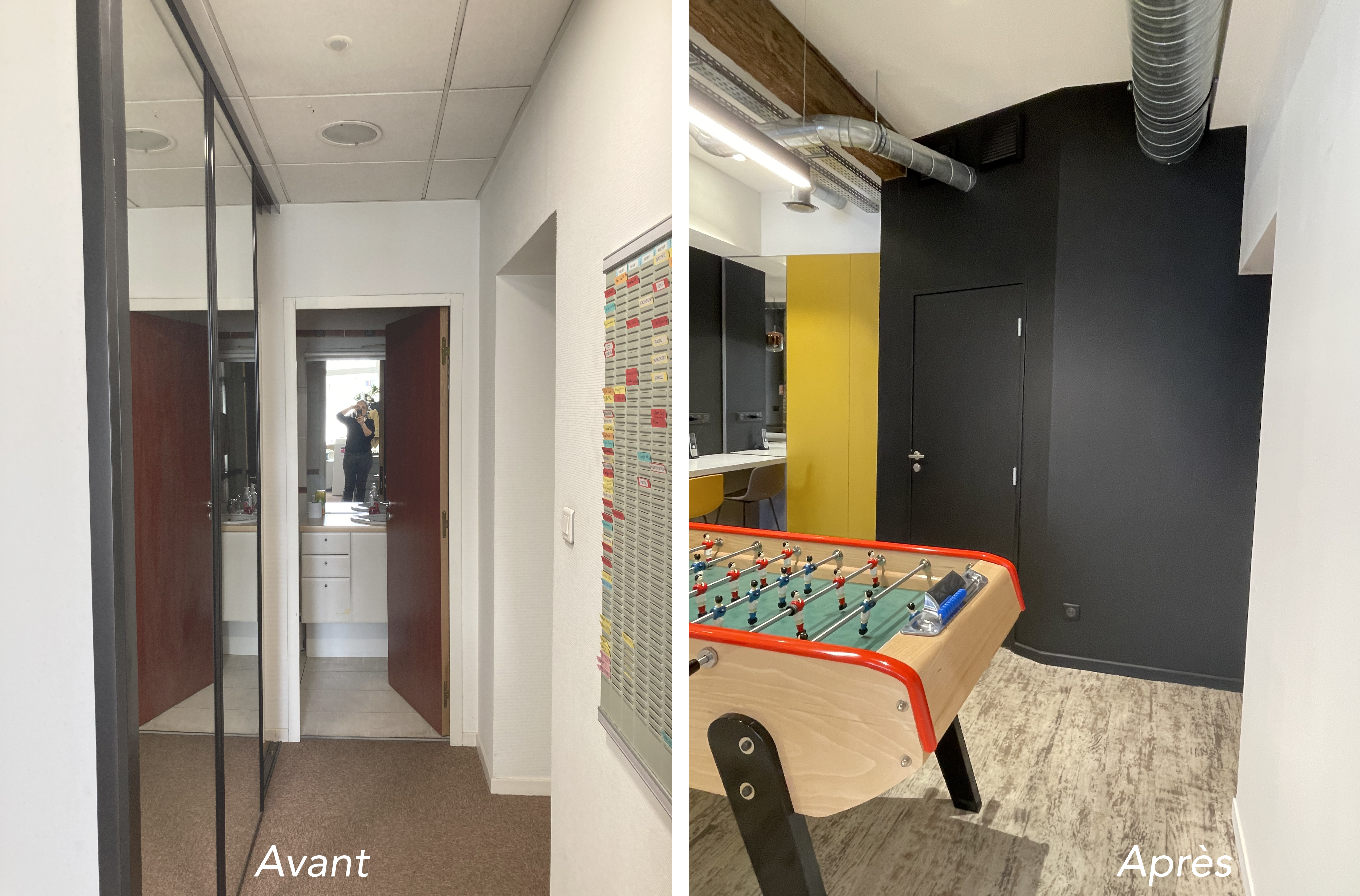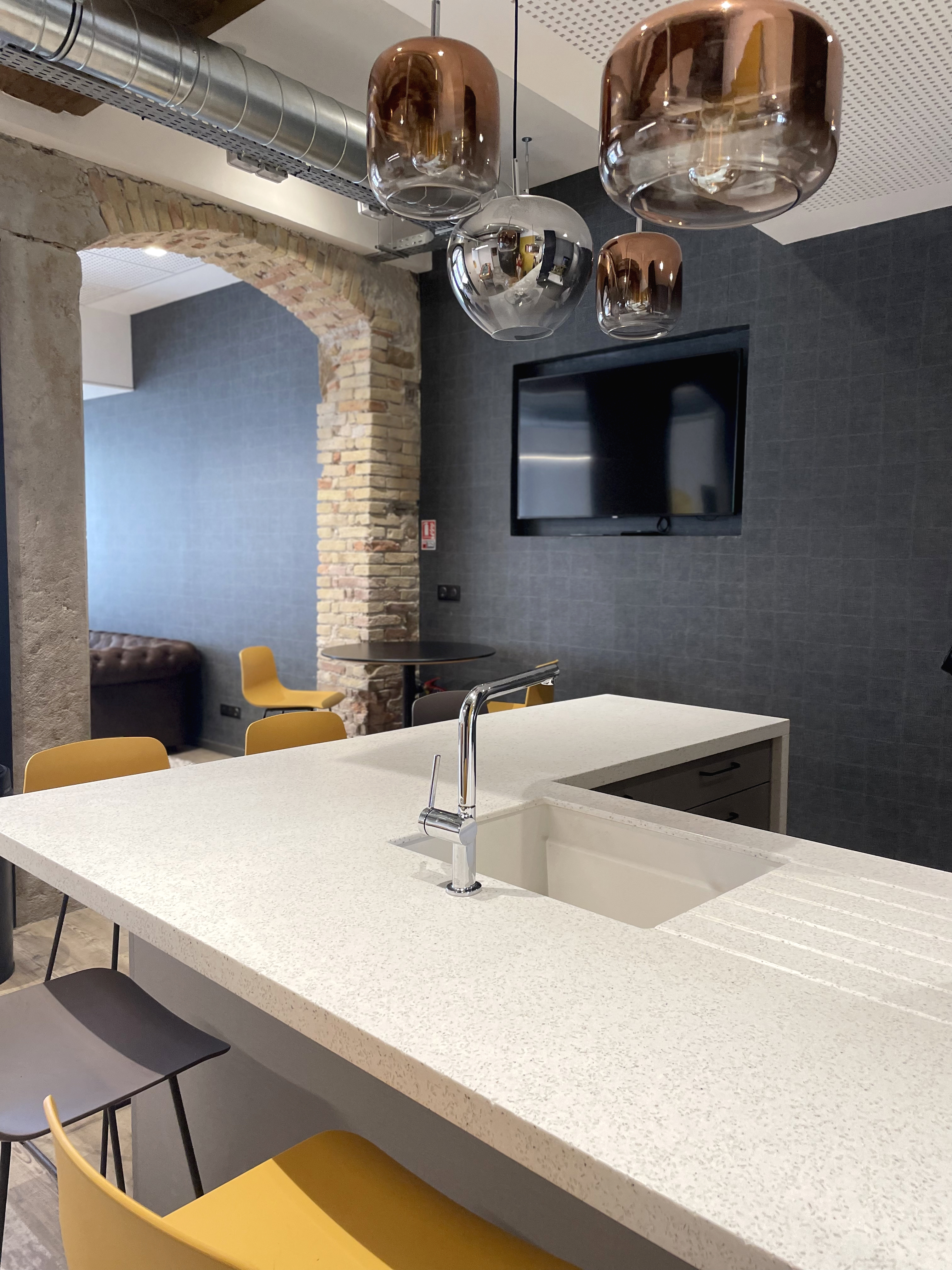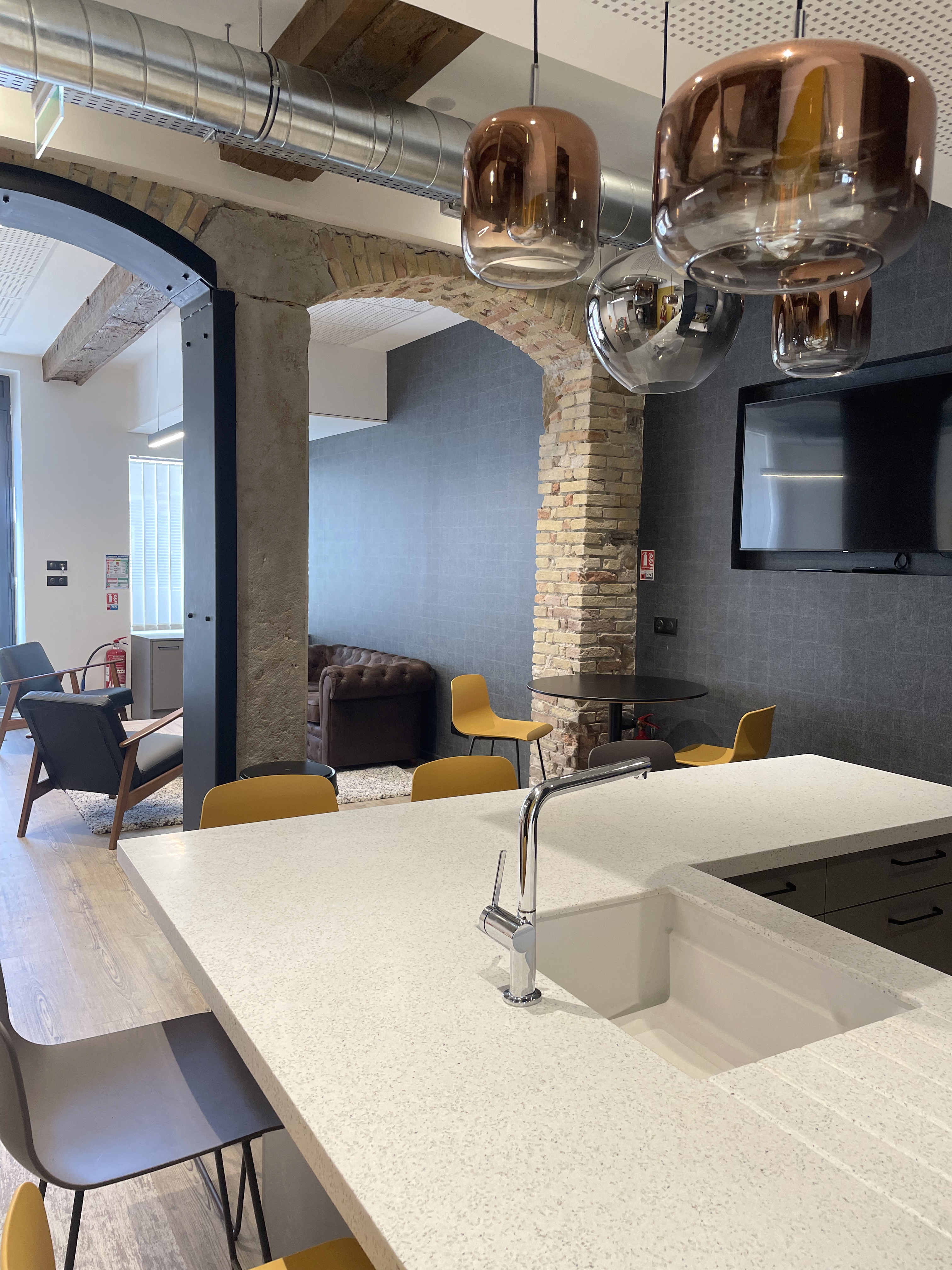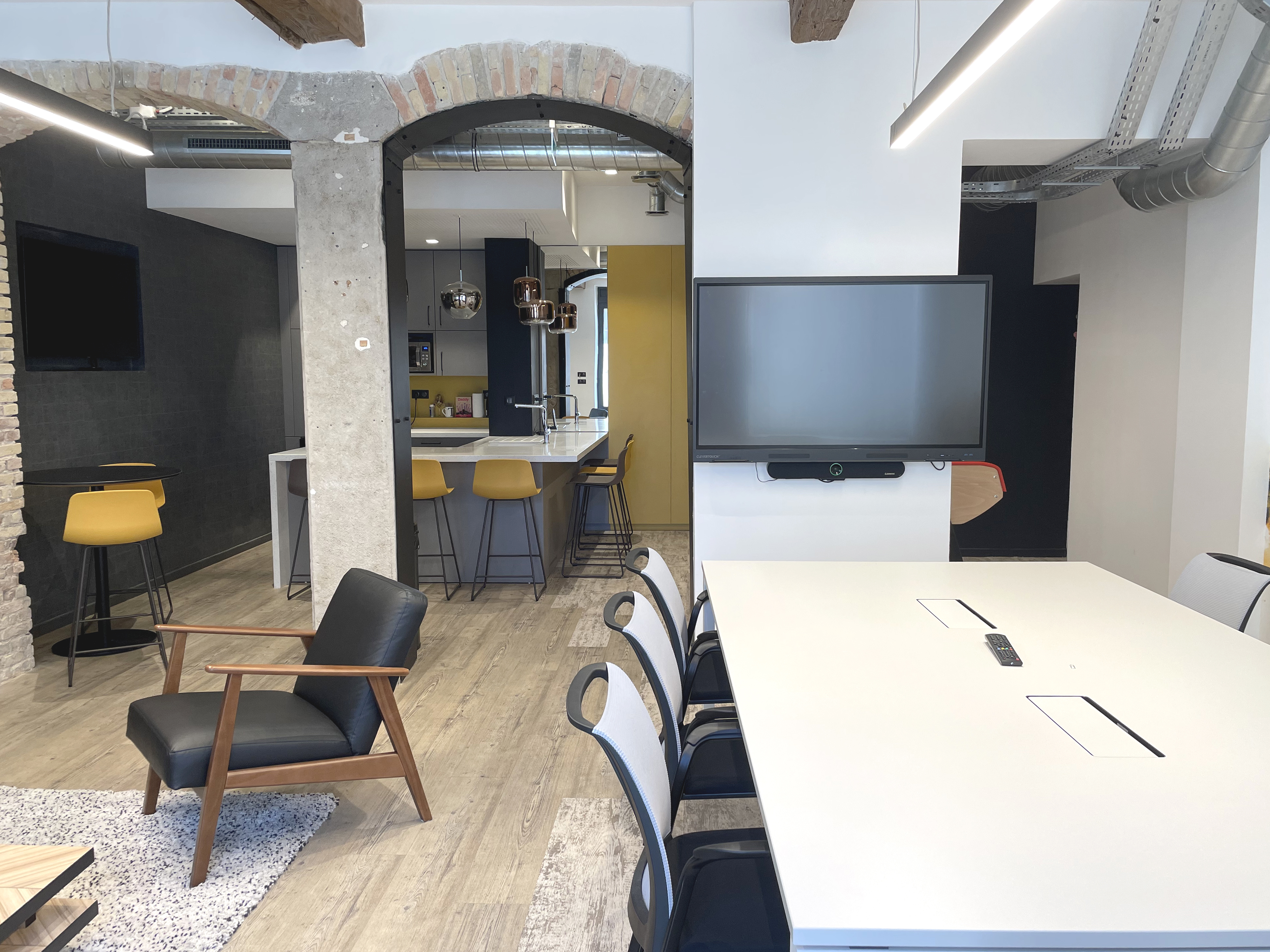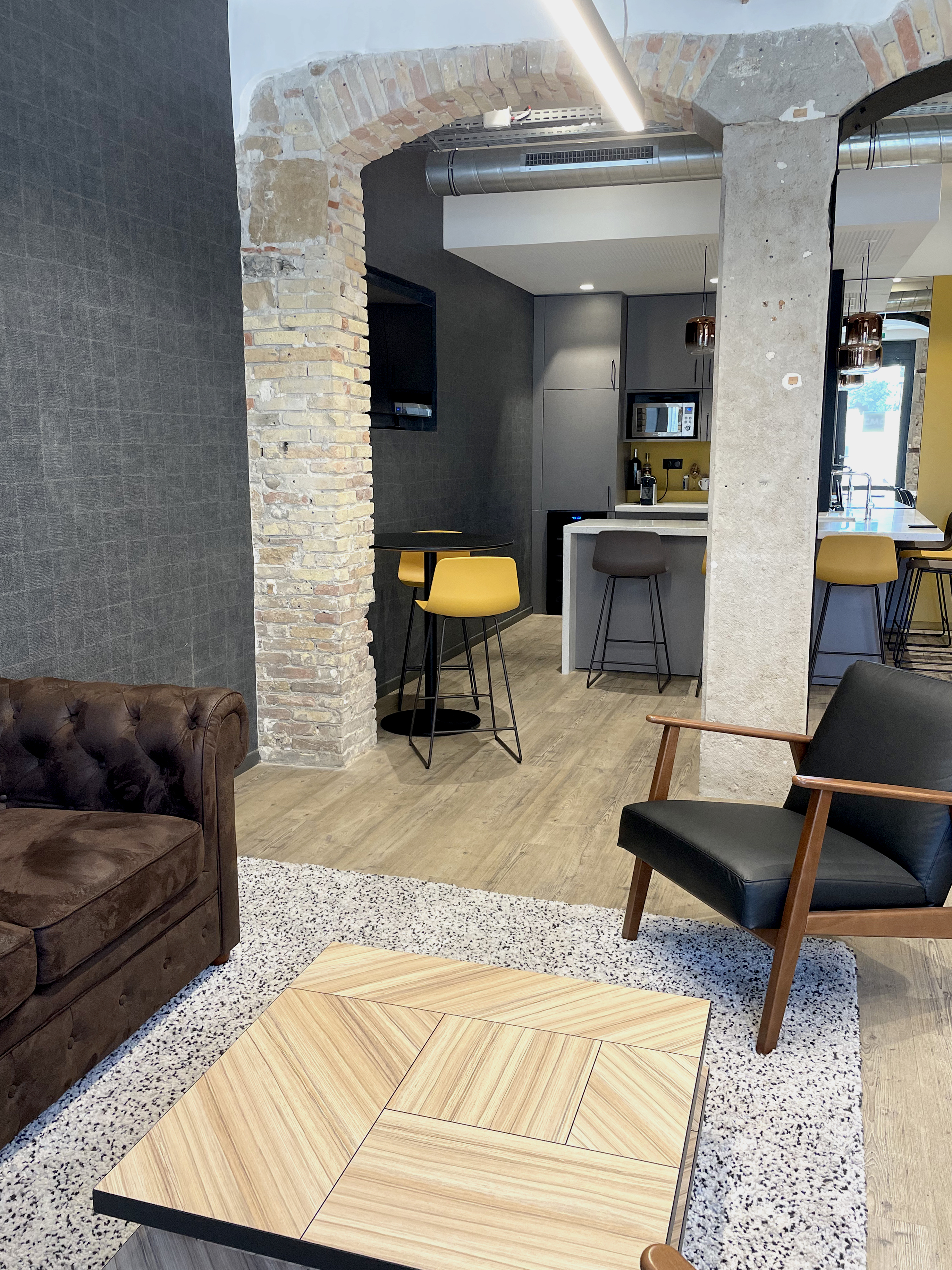 Ce projet pour l’entreprise CMC combine élégance et fonctionnalité pour créer un lieu de réception unique. Nous avons sublimé le caractère du local en mettant en valeur les murs en pierres et les linteaux existants découverts lors de la démolition. Les volumes ont été ouverts pour offrir une cuisine moderne et accueillante, un espace de réunion baigné de lumière, une zone de jeux dynamique et un coin détente avec canapé. La skyline Lyonnaise revisitée sur un papier peint original, insuffle énergie et modernité à cet espace, favorisant la convivialité et le partage.