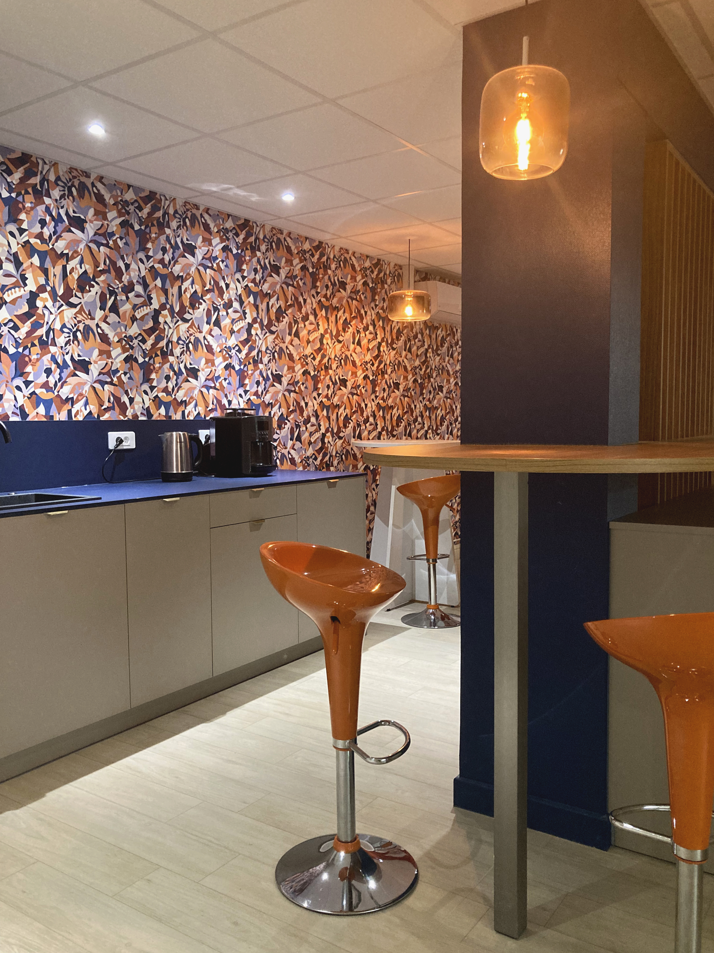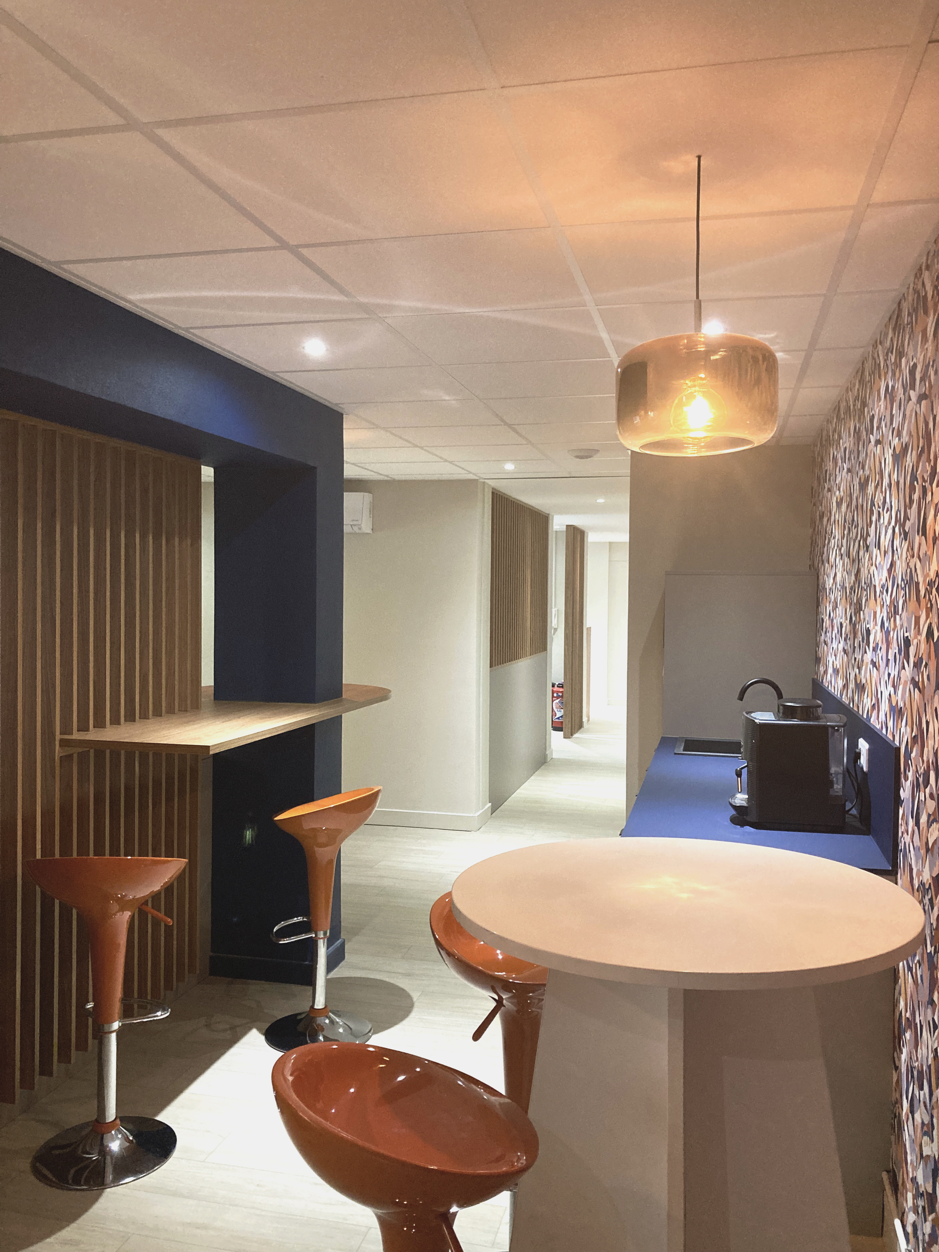 Nous avons redistribué les circulations existantes très linéaires pour ouvrir les volumes et créer des espaces de convivialité au coeur des espaces de travail tout en préservant l’intimité des postes. Répartis sur deux niveaux, les espaces d’accueil, de bureaux, de réunions et de pauses offrent un équilibre parfait entre travail et détente. Par les couleurs et les matériaux, nous avons créé une ambiance dynamique favorisant un cadre de travail harmonieux et inspirant.