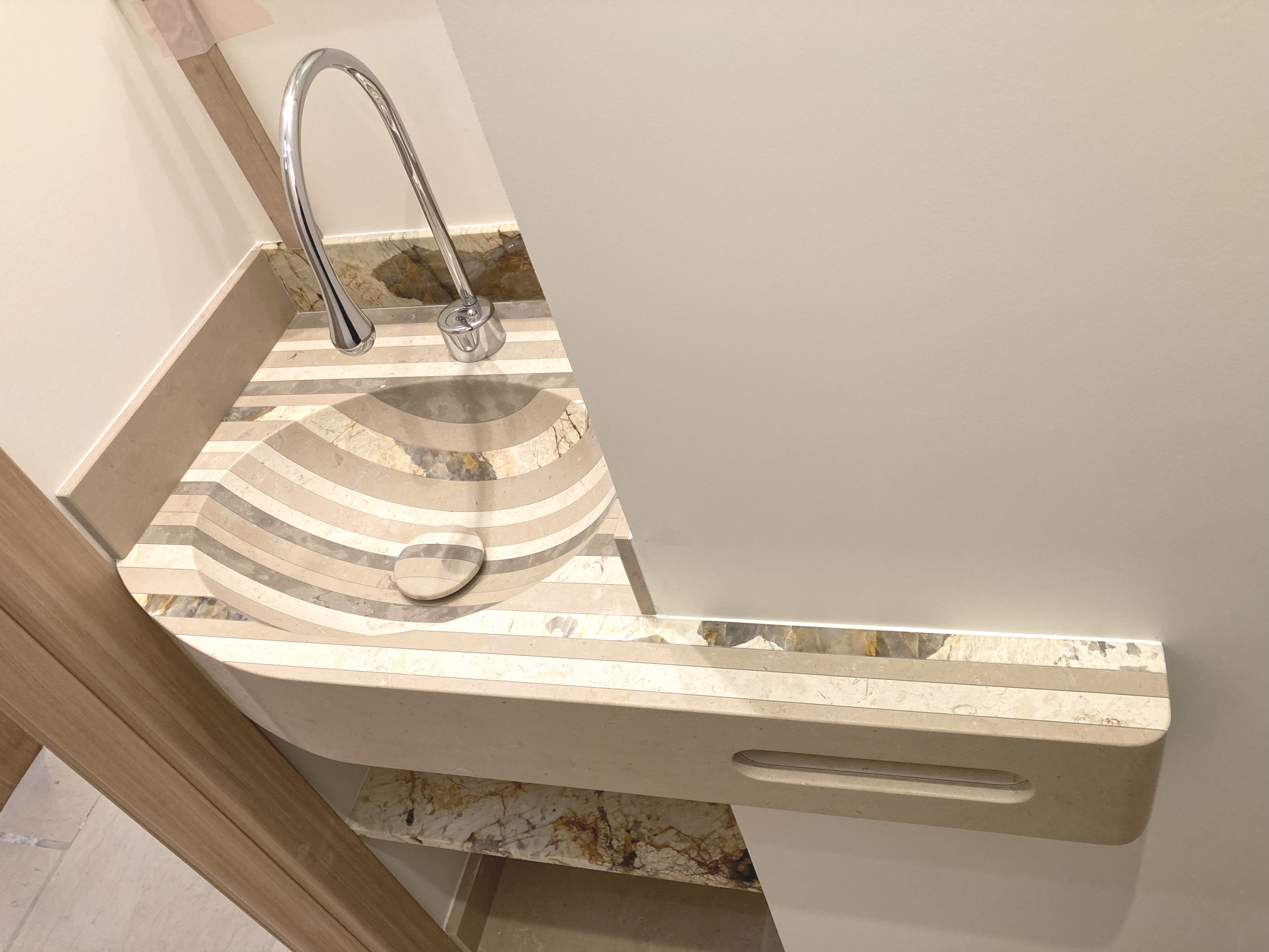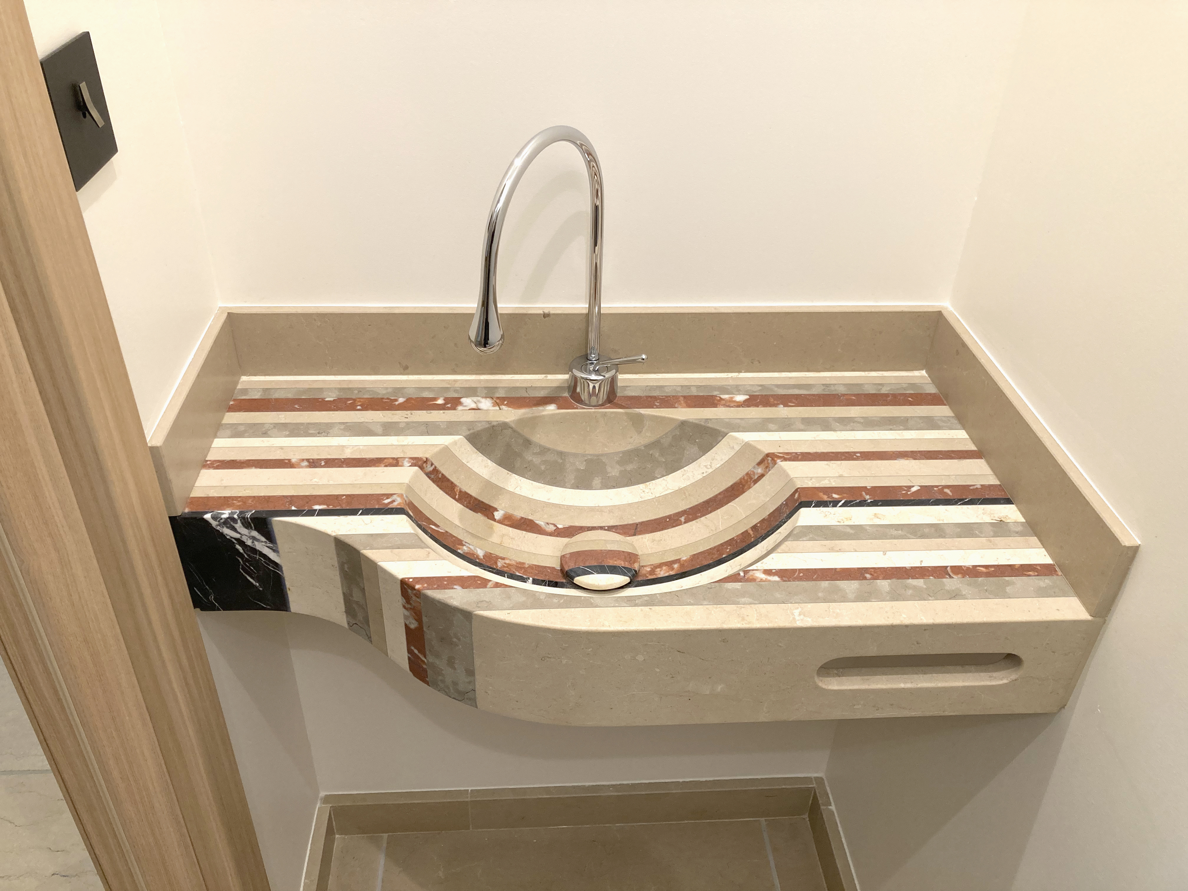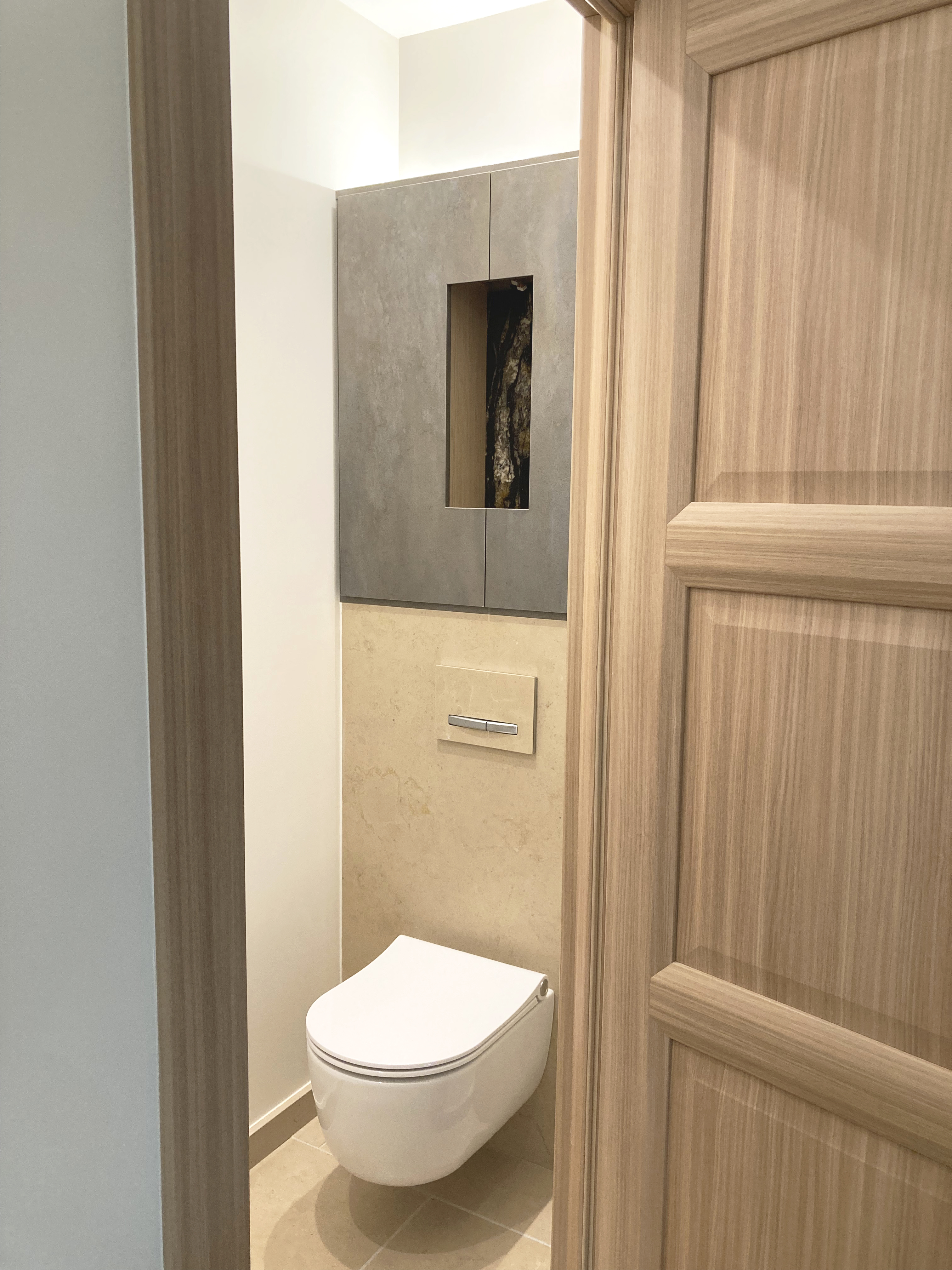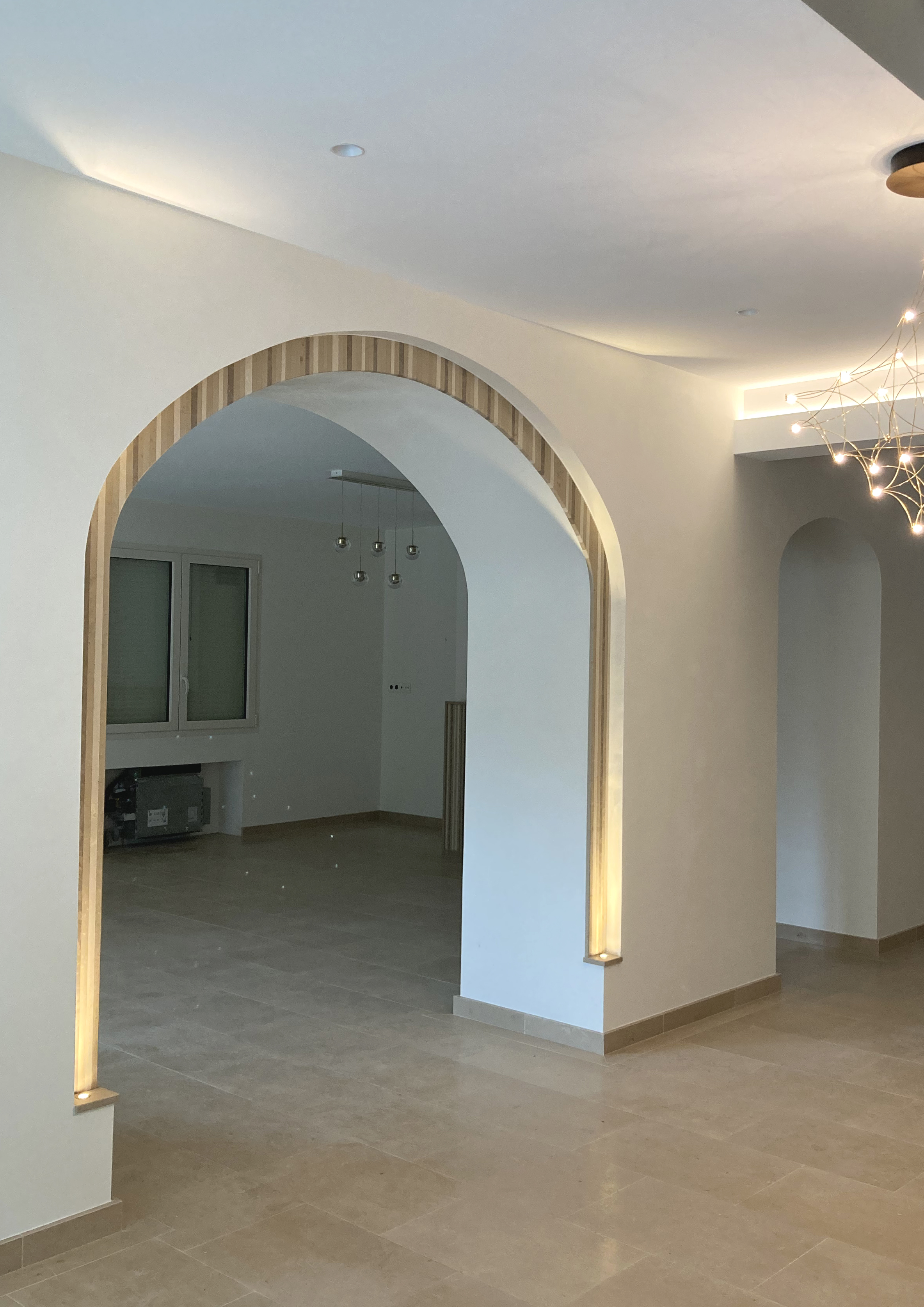 Nos choix de matériaux ont été guidés par une recherche d’authenticité et de qualité. La pierre naturelle, travaillée avec le savoir-faire exceptionnel du procédé lamellé roches® de la marbrerie Maison Derudet est omniprésente dans ce projet. Les plans vasques sur mesure et l’arche en pierre ajoutent des touches uniques et raffinées à l’ensemble. Cette réalisation illustre notre approche : sublimer les espaces tout en mettant en valeur des matériaux nobles et le travail d’artisans passionnés.