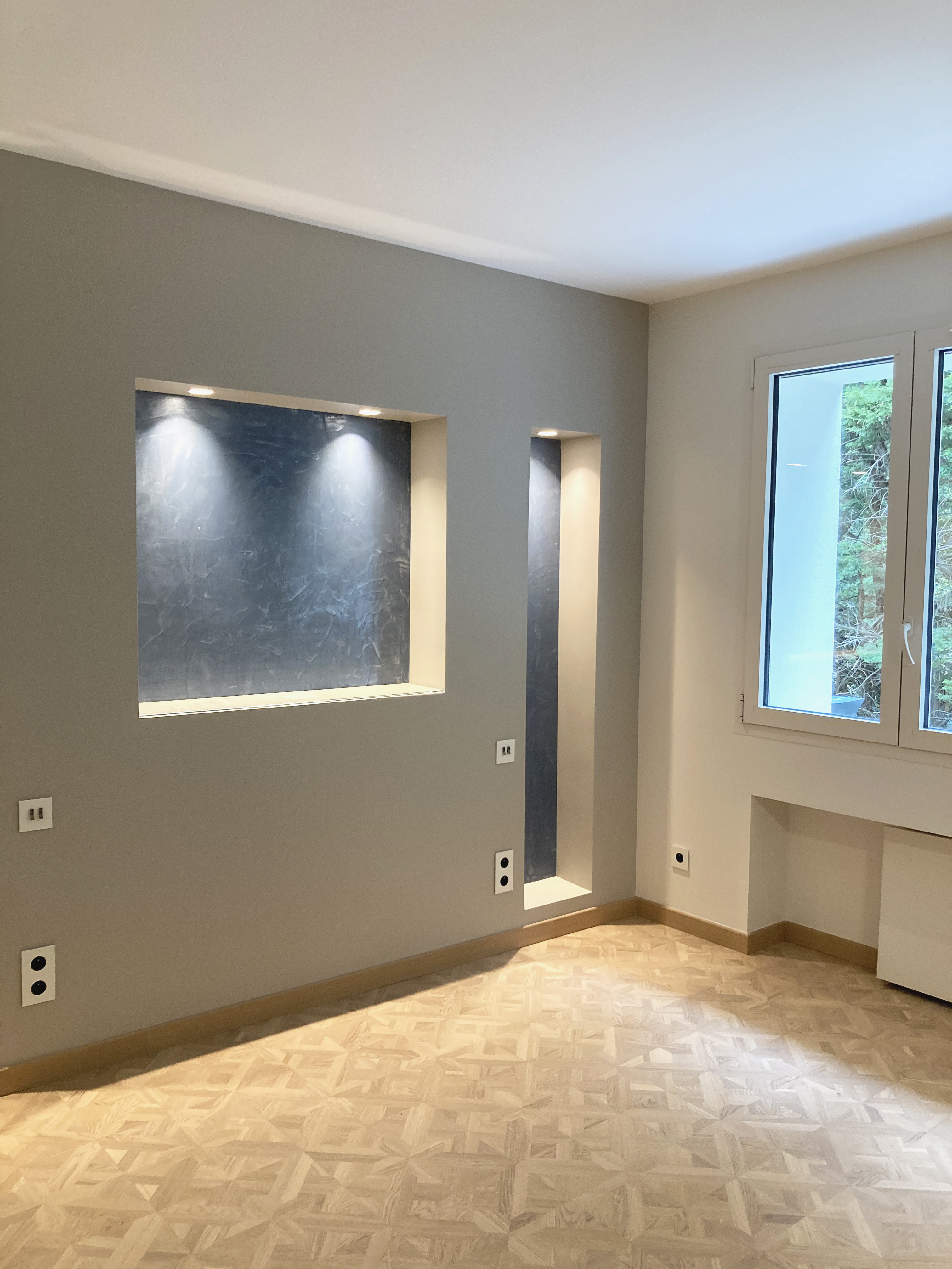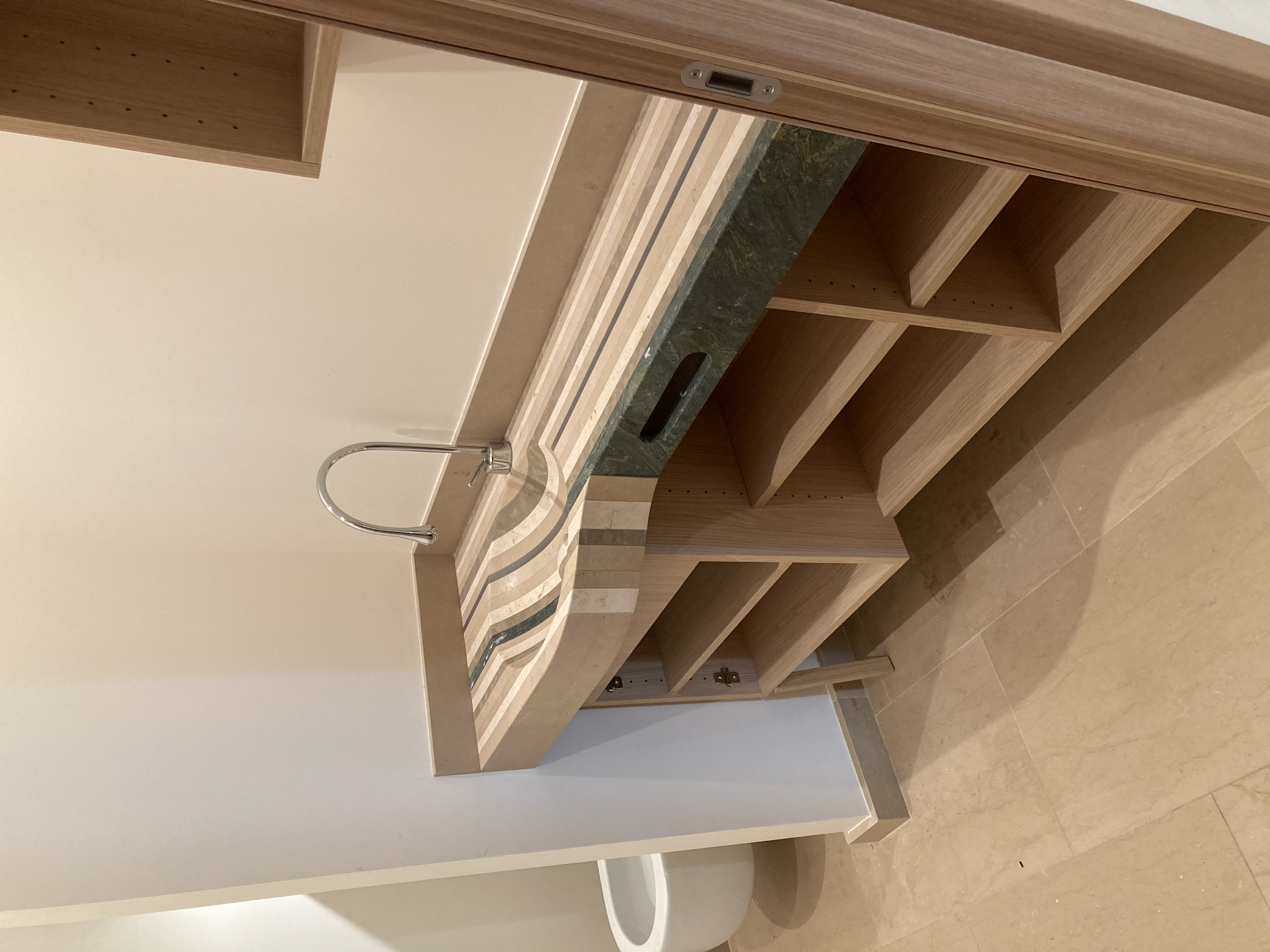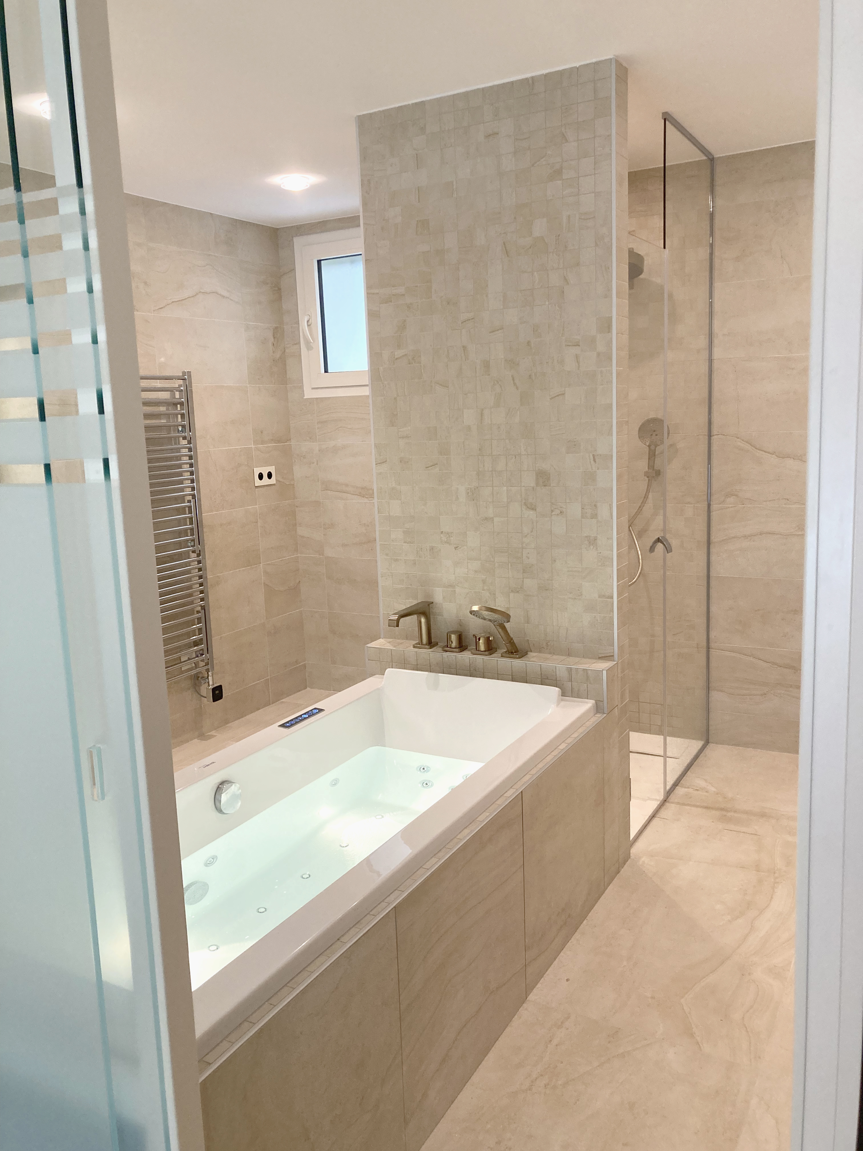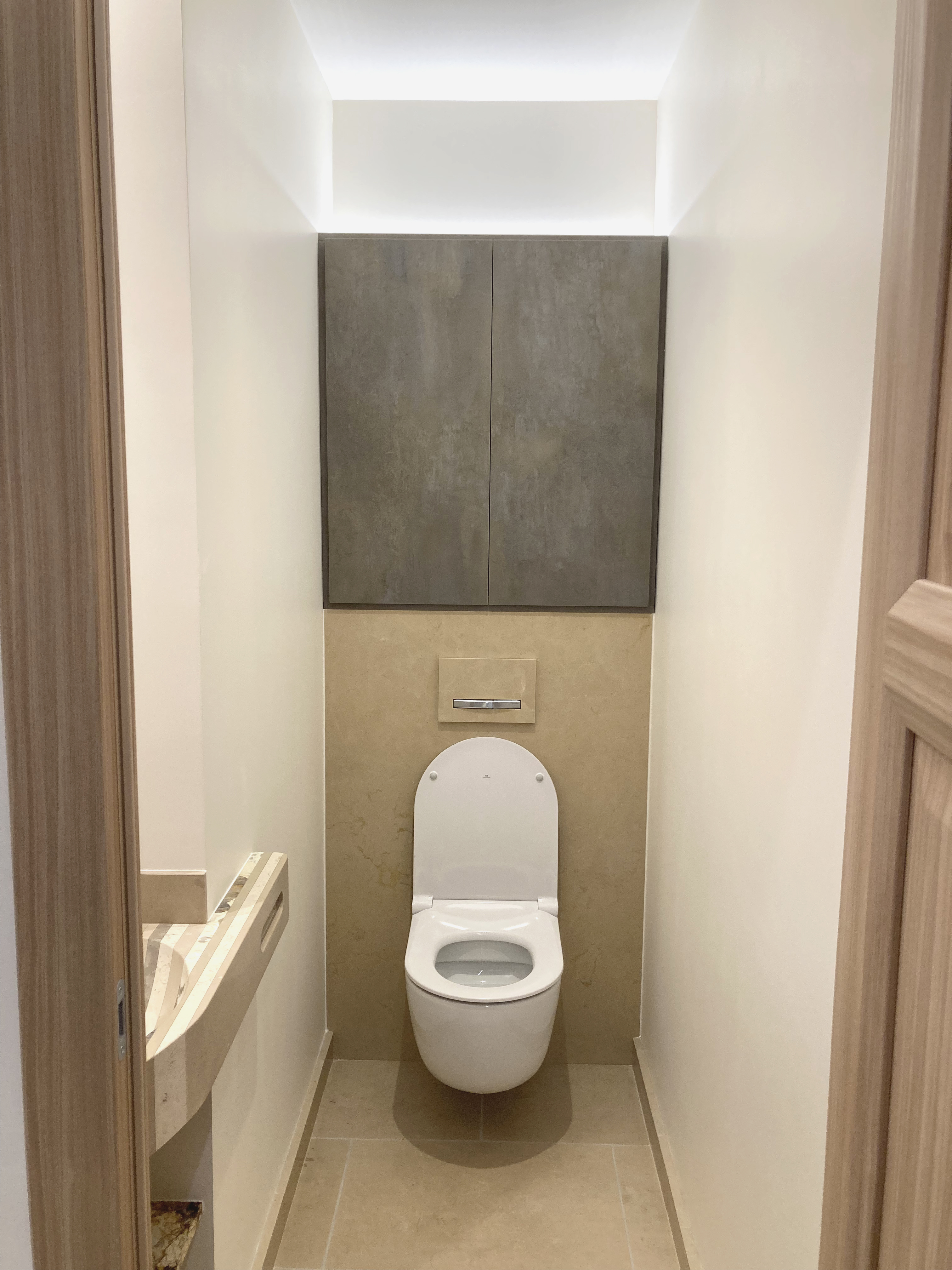 Nos choix de matériaux ont été guidés par une recherche d’authenticité et de qualité. La pierre naturelle, travaillée avec le savoir-faire exceptionnel du procédé lamellé roches® de la marbrerie Maison Derudet est omniprésente dans ce projet. Les plans vasques sur mesure et l’arche en pierre ajoutent des touches uniques et raffinées à l’ensemble. Cette réalisation illustre notre approche : sublimer les espaces tout en mettant en valeur des matériaux nobles et le travail d’artisans passionnés.