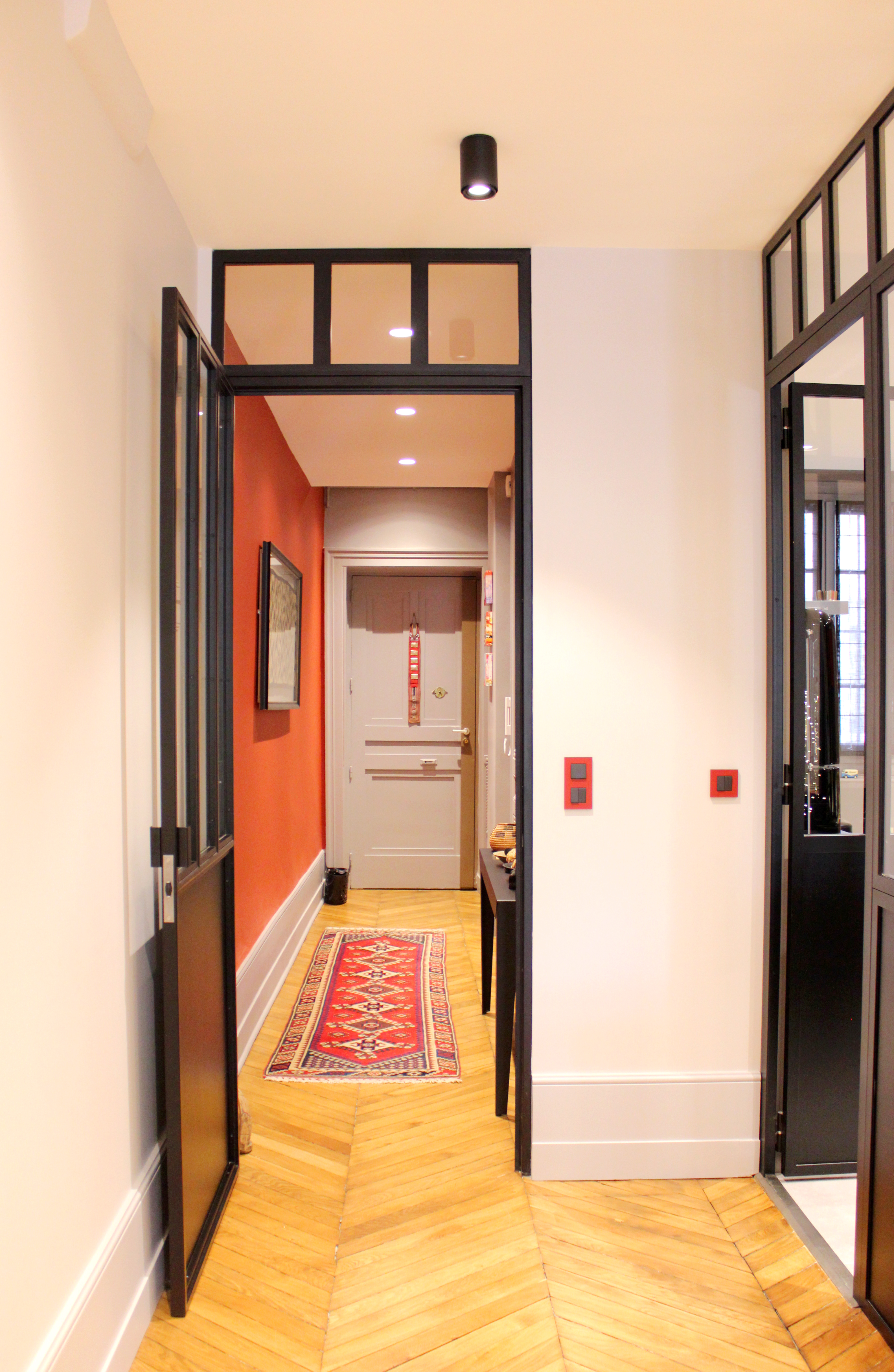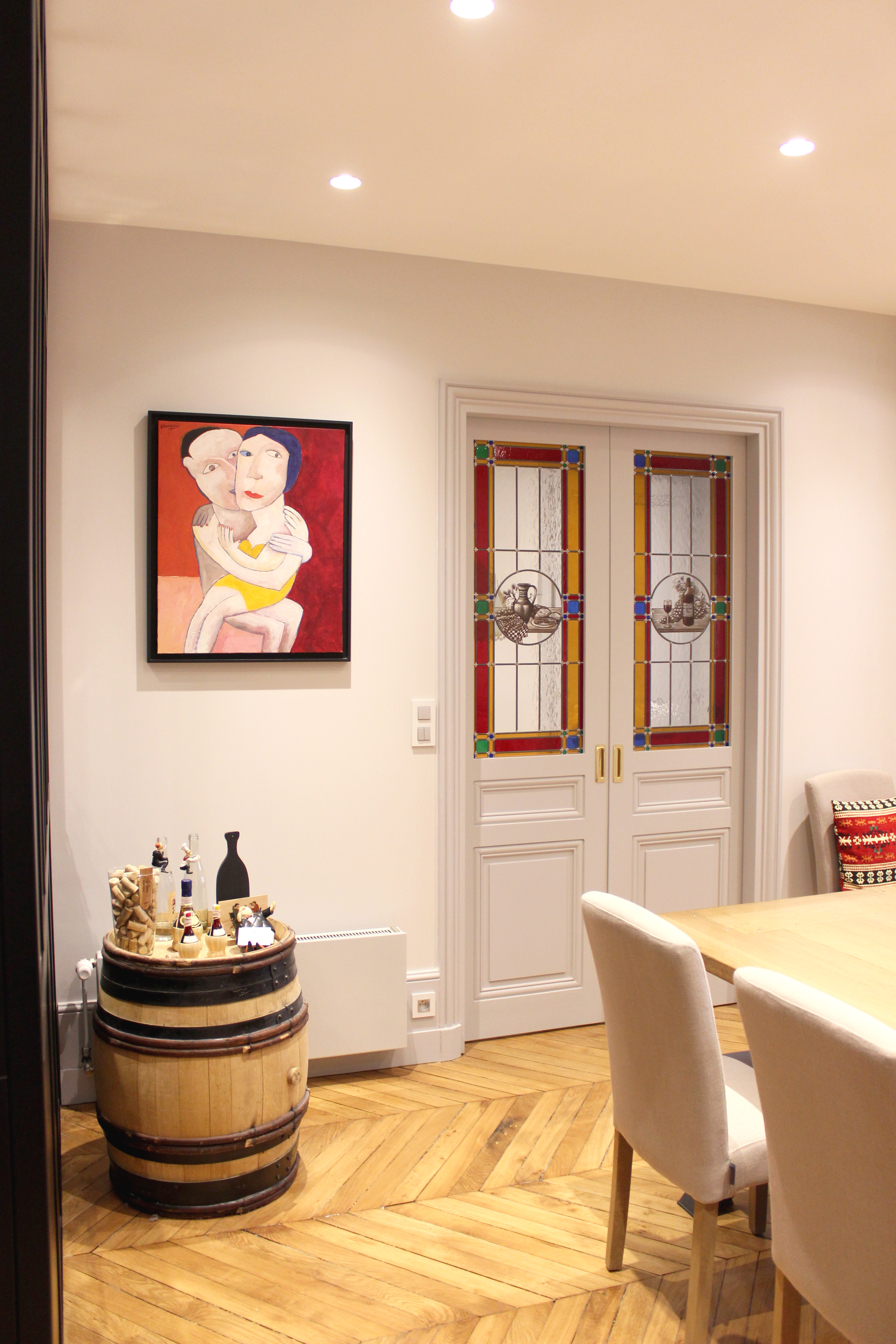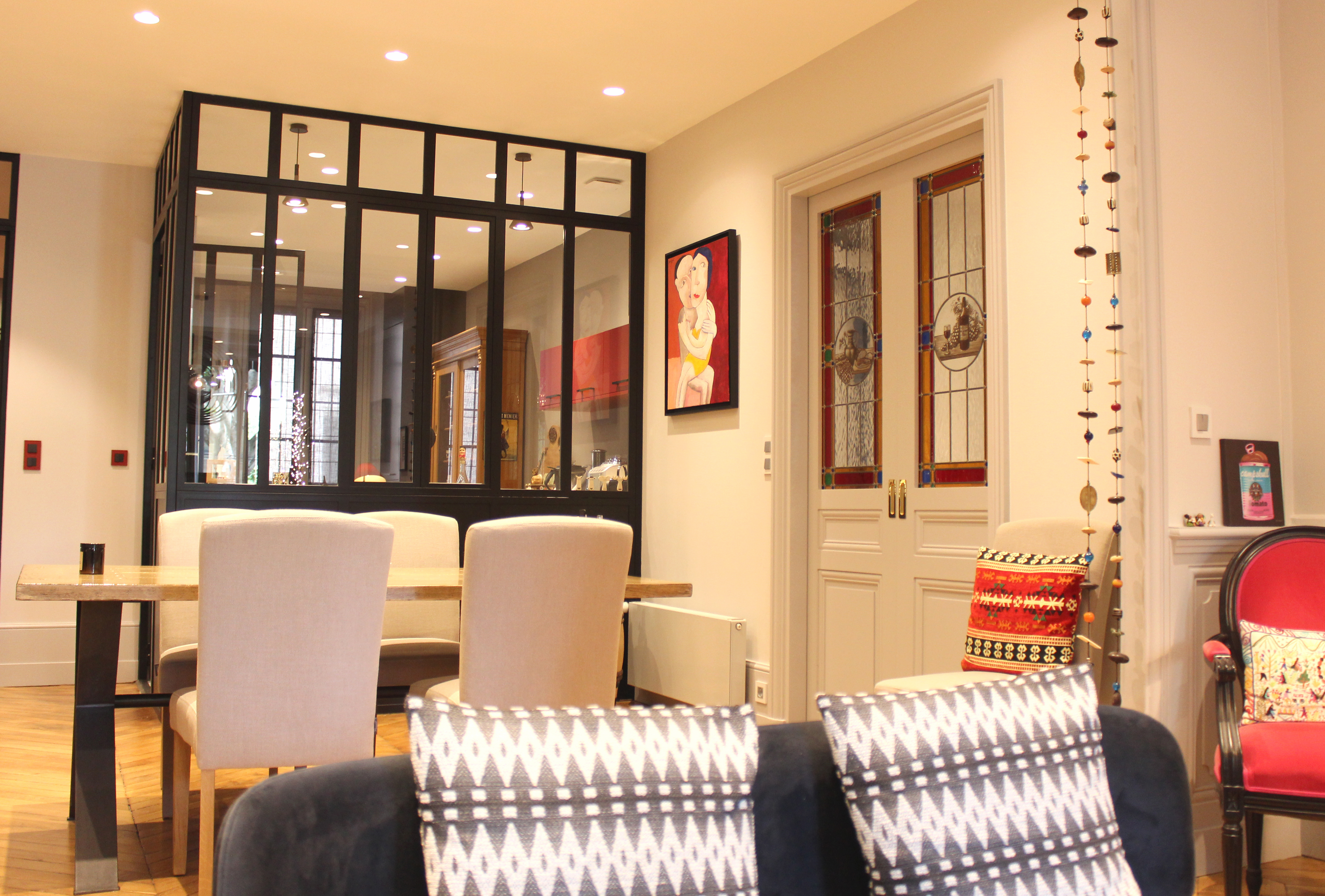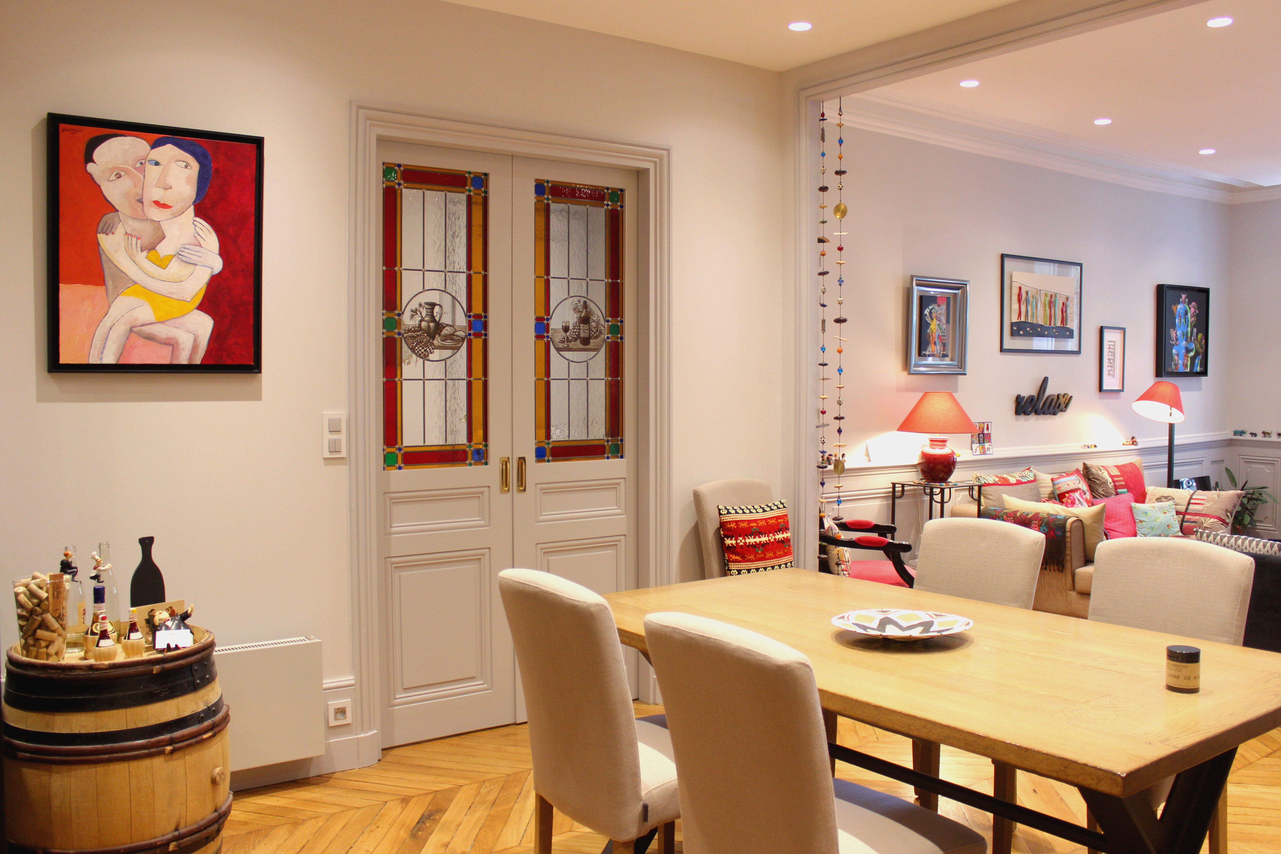 Cet appartement bourgeois de l’avenue de Saxe a été entièrement repensé pour conjuguer élégance classique et modernité. La verrière industrielle et les vitraux réalisés par Vitrail Saint Georges s’intègrent harmonieusement aux parquets fougère et corniches d’époque. Le rouge et le noir structurent les pièces de réception, tandis que les souvenirs de voyage des propriétaires apportent une touche personnelle et chaleureuse.