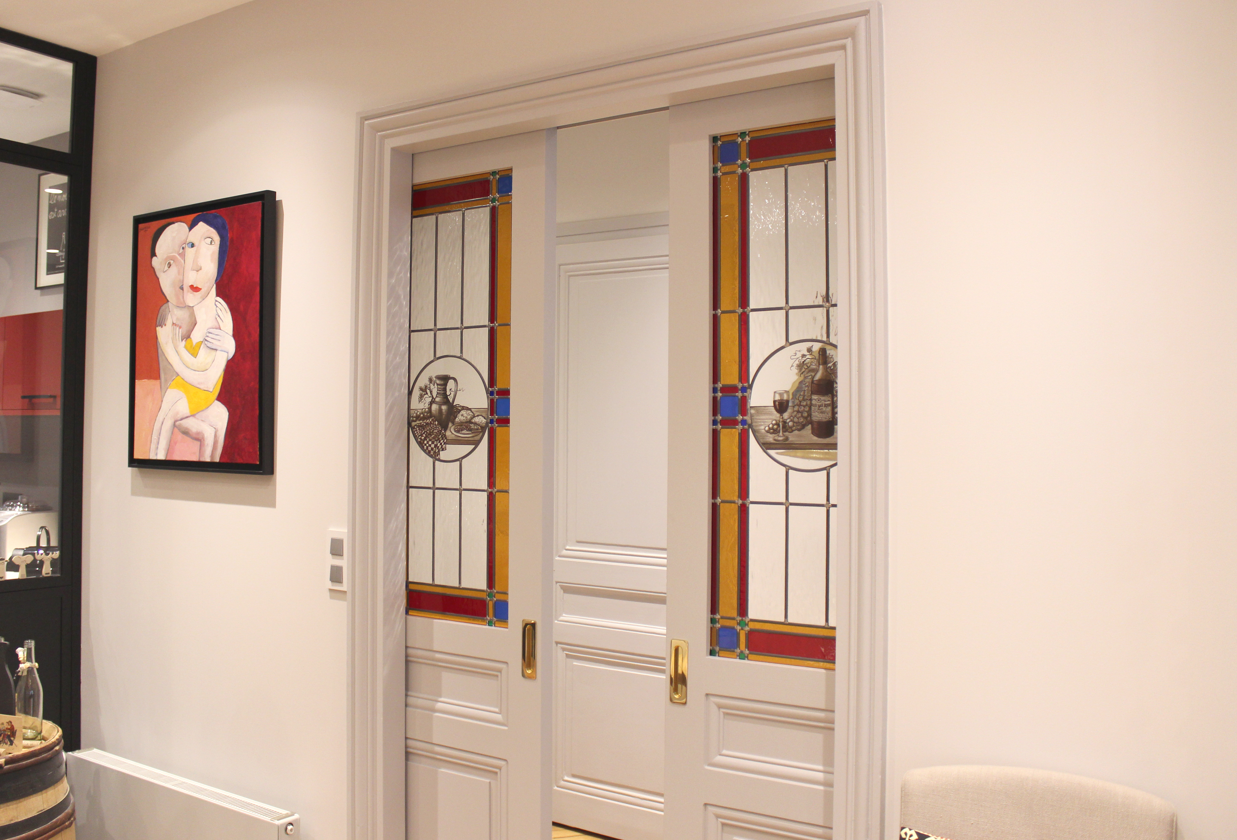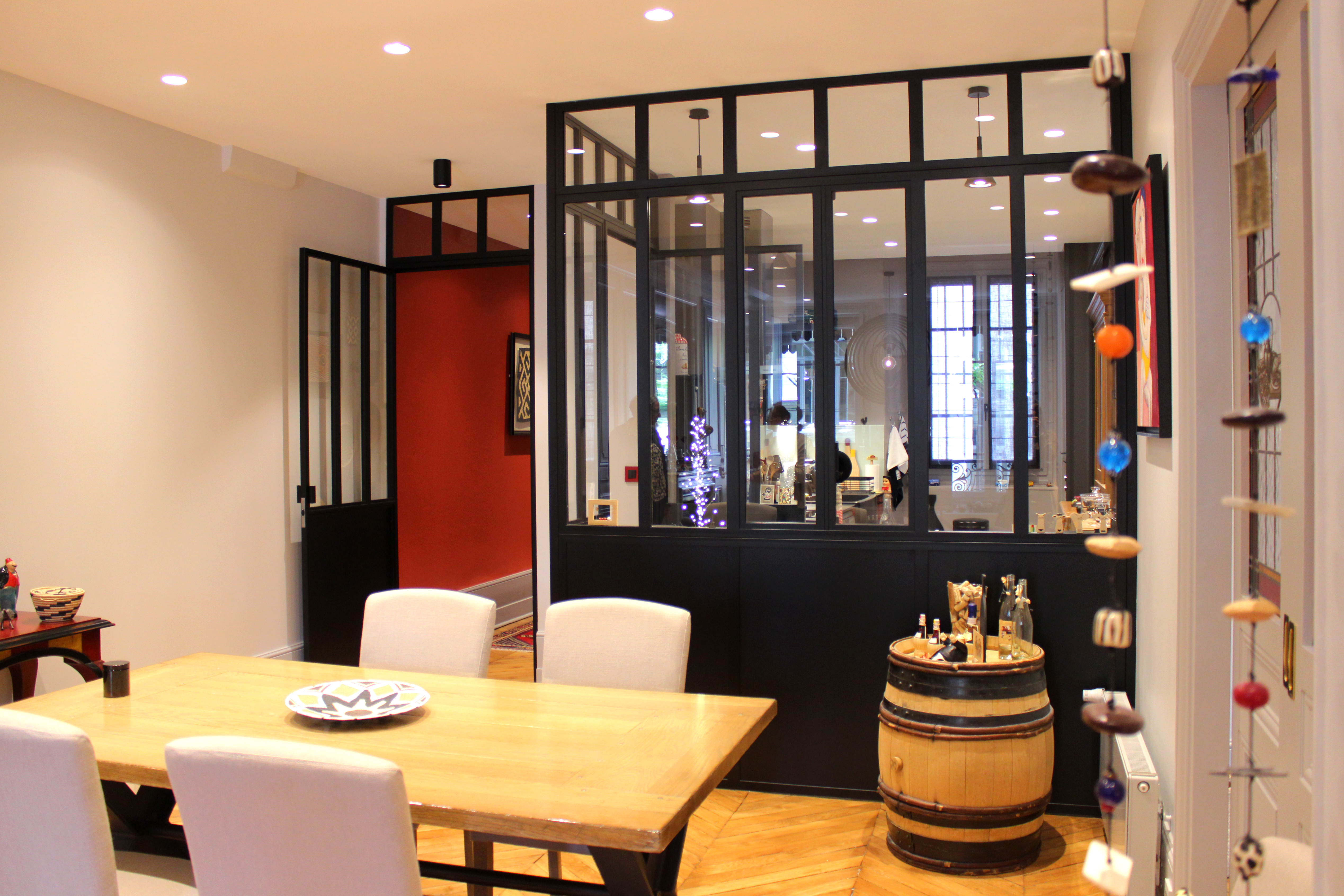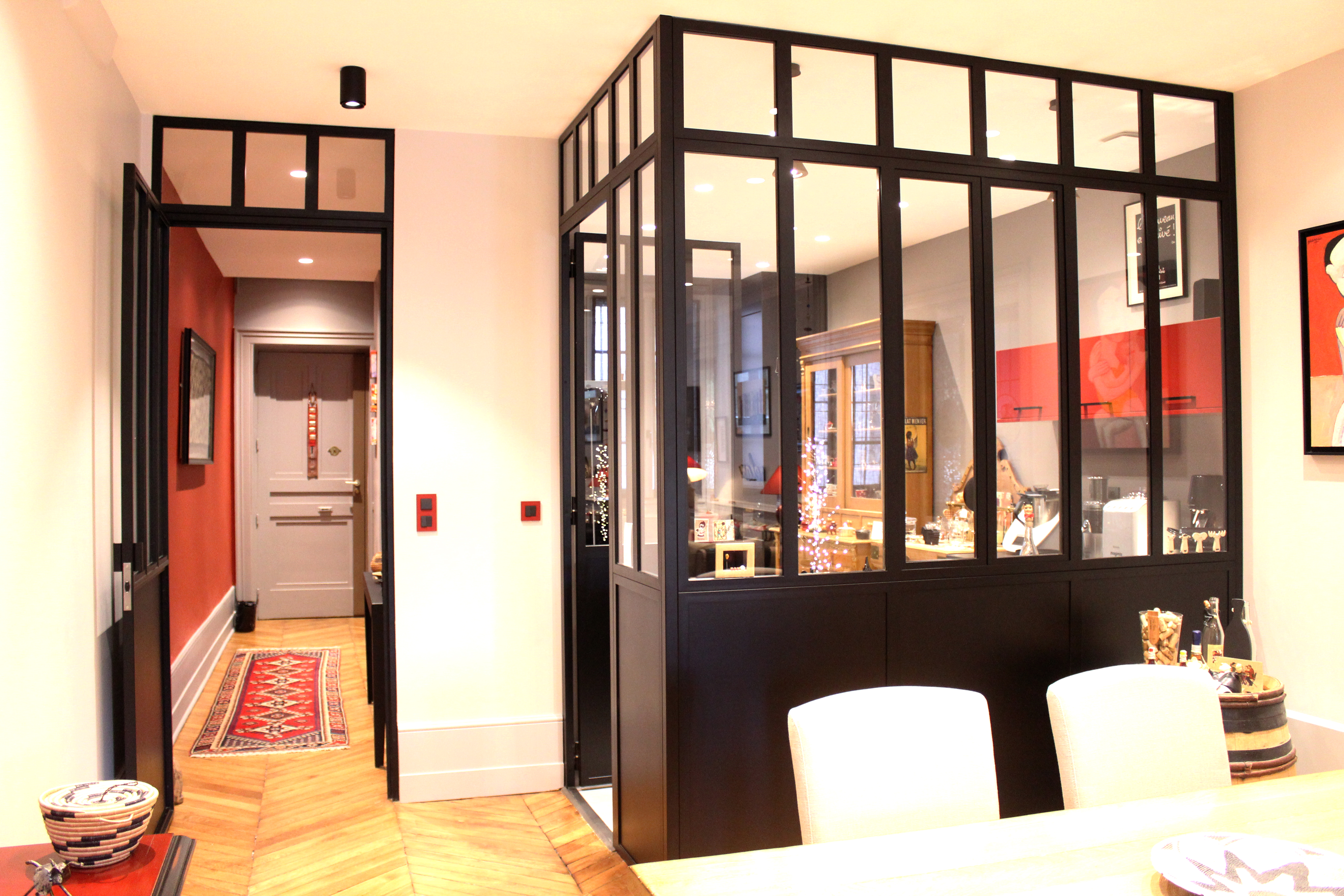 Cet appartement bourgeois de l’avenue de Saxe a été entièrement repensé pour conjuguer élégance classique et modernité. La verrière industrielle et les vitraux réalisés par Vitrail Saint Georges s’intègrent harmonieusement aux parquets fougère et corniches d’époque. Le rouge et le noir structurent les pièces de réception, tandis que les souvenirs de voyage des propriétaires apportent une touche personnelle et chaleureuse.