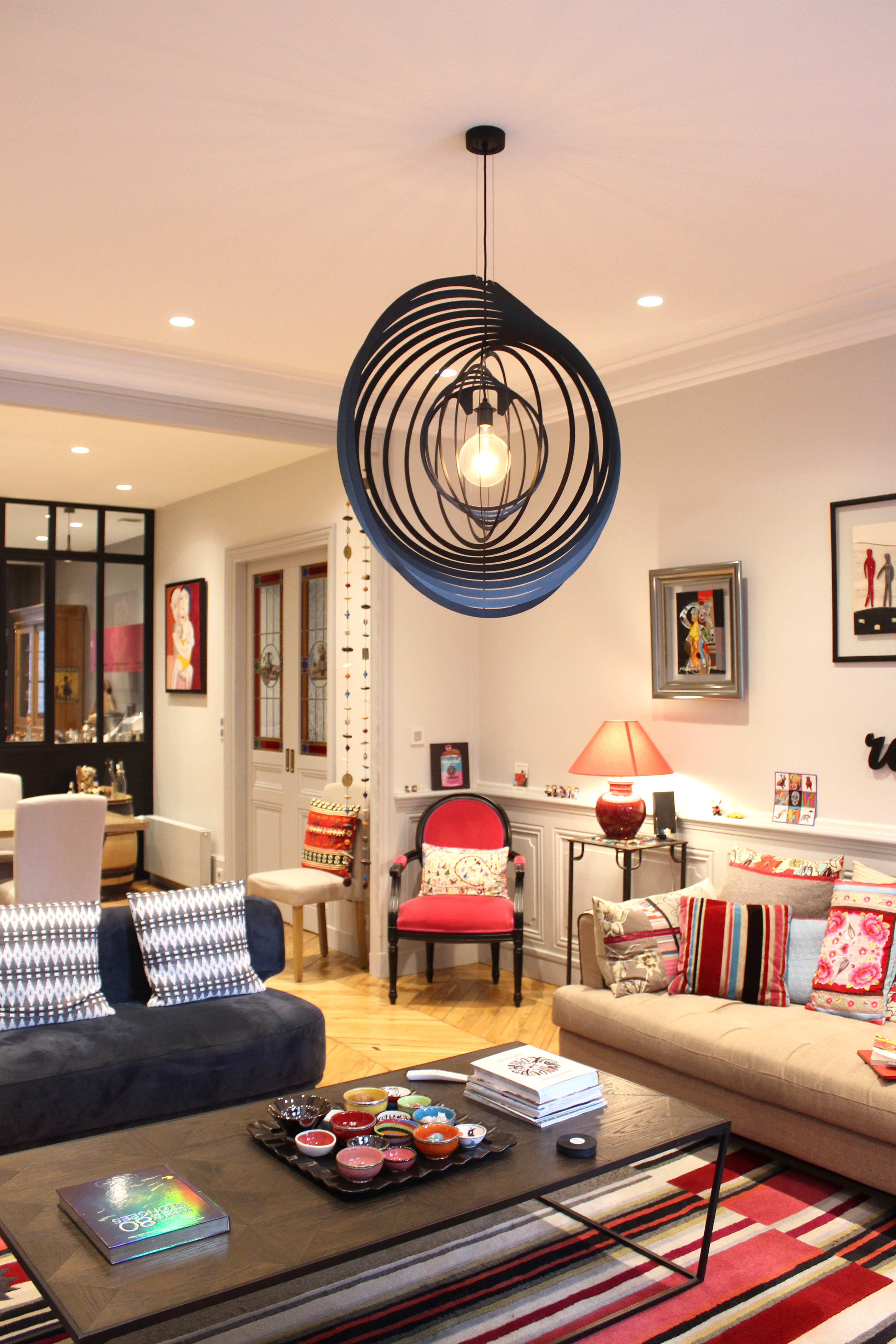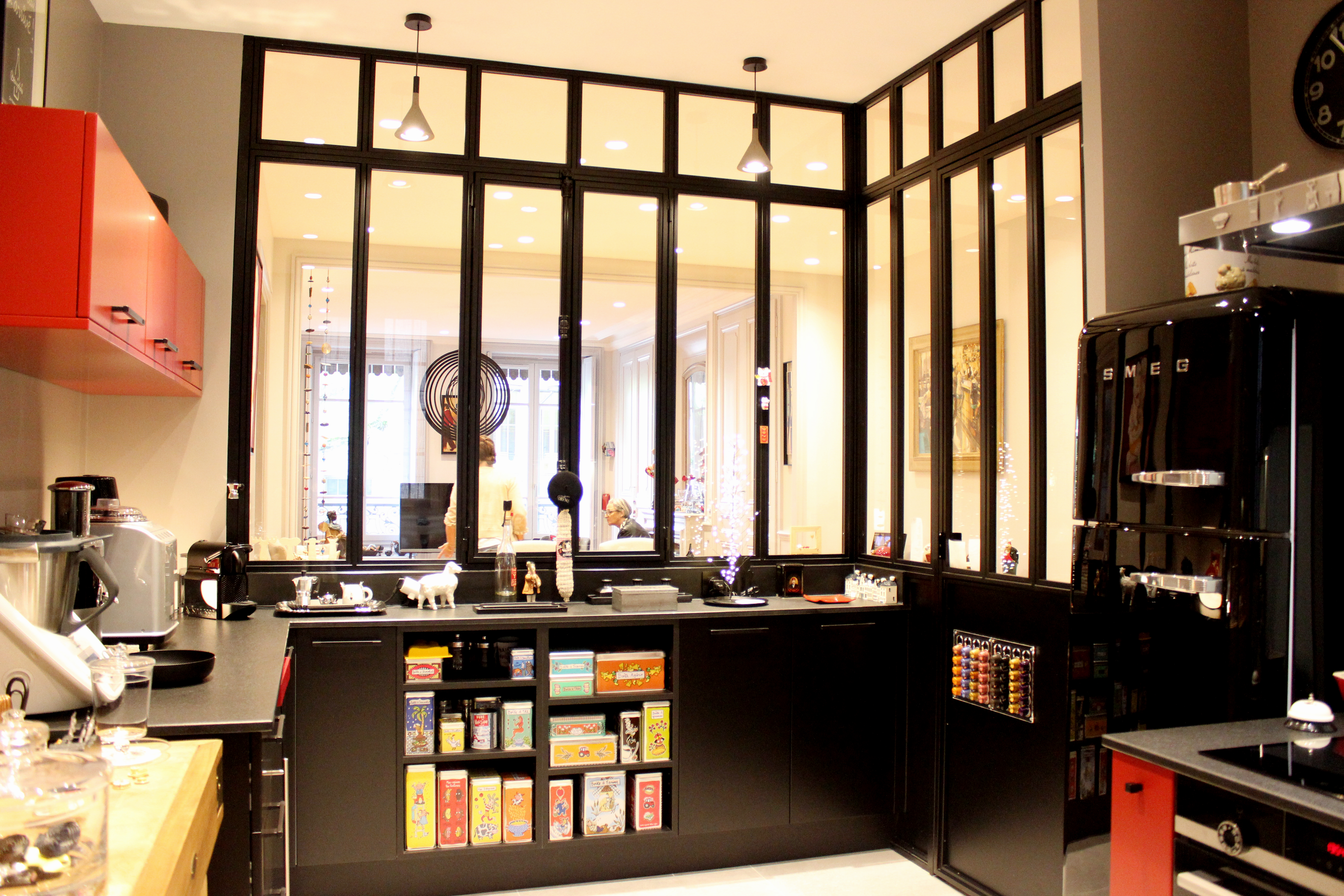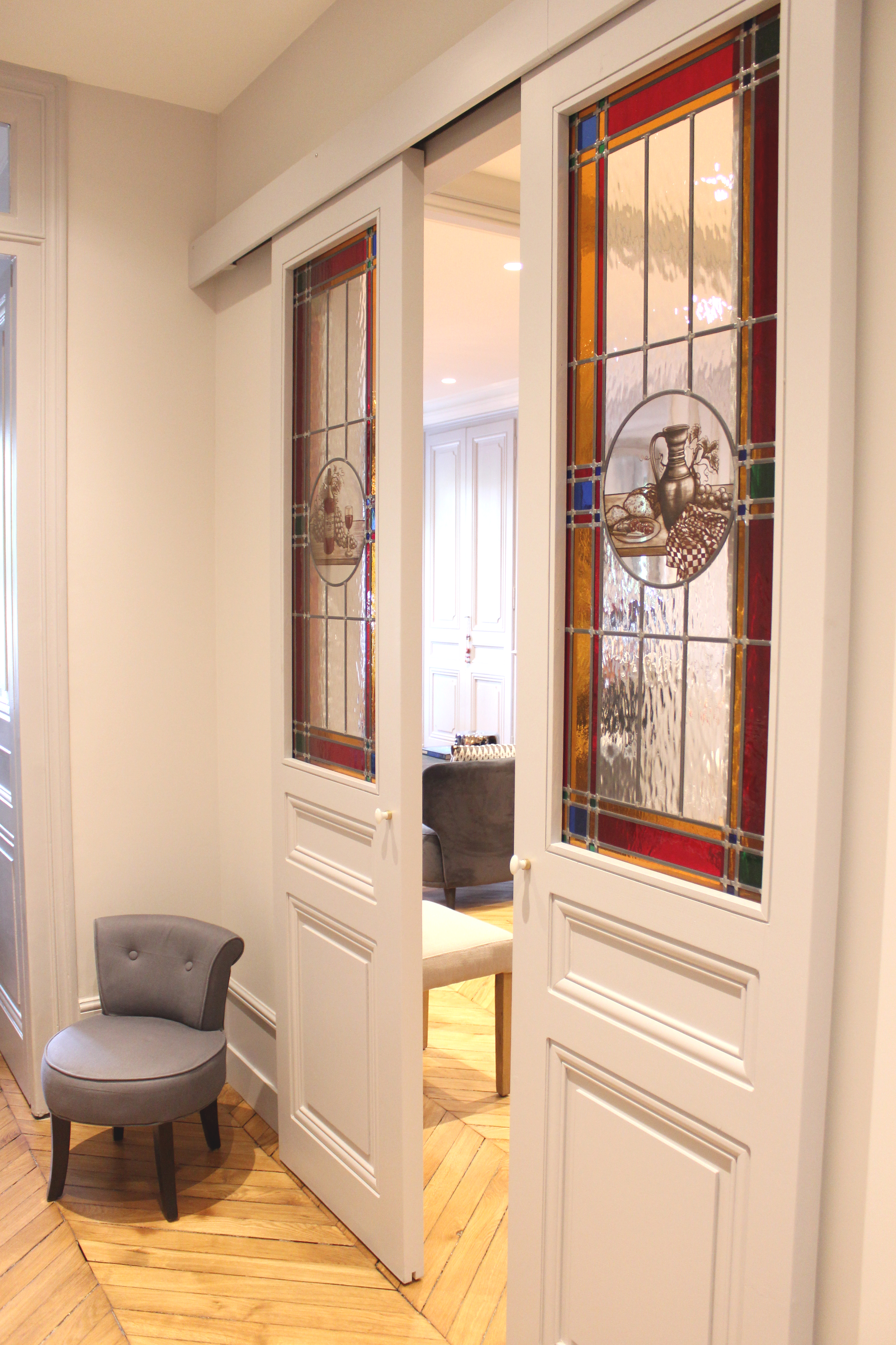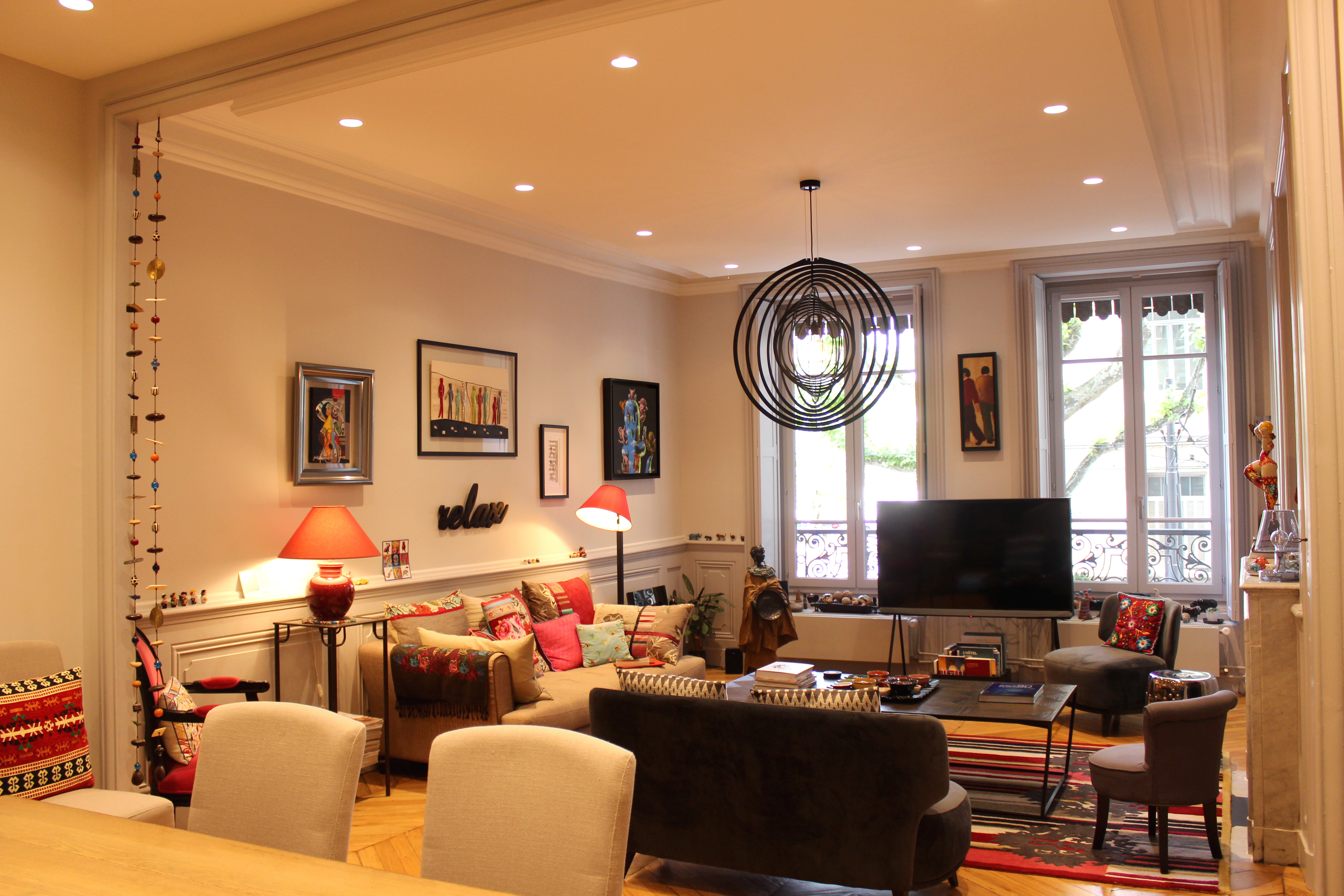 Cet appartement bourgeois de l’avenue de Saxe a été entièrement repensé pour conjuguer élégance classique et modernité. La verrière industrielle et les vitraux réalisés par Vitrail Saint Georges s’intègrent harmonieusement aux parquets fougère et corniches d’époque. Le rouge et le noir structurent les pièces de réception, tandis que les souvenirs de voyage des propriétaires apportent une touche personnelle et chaleureuse.