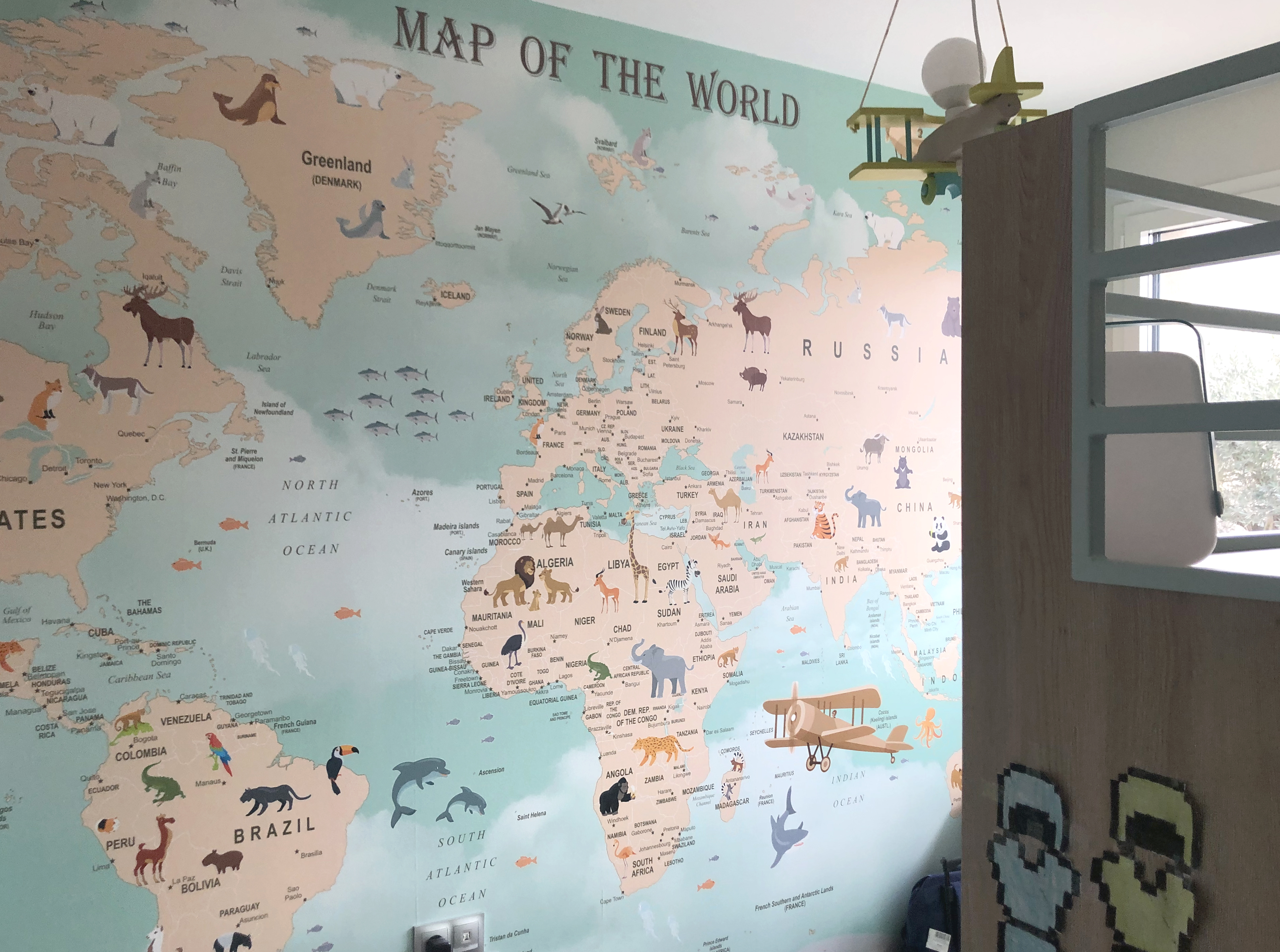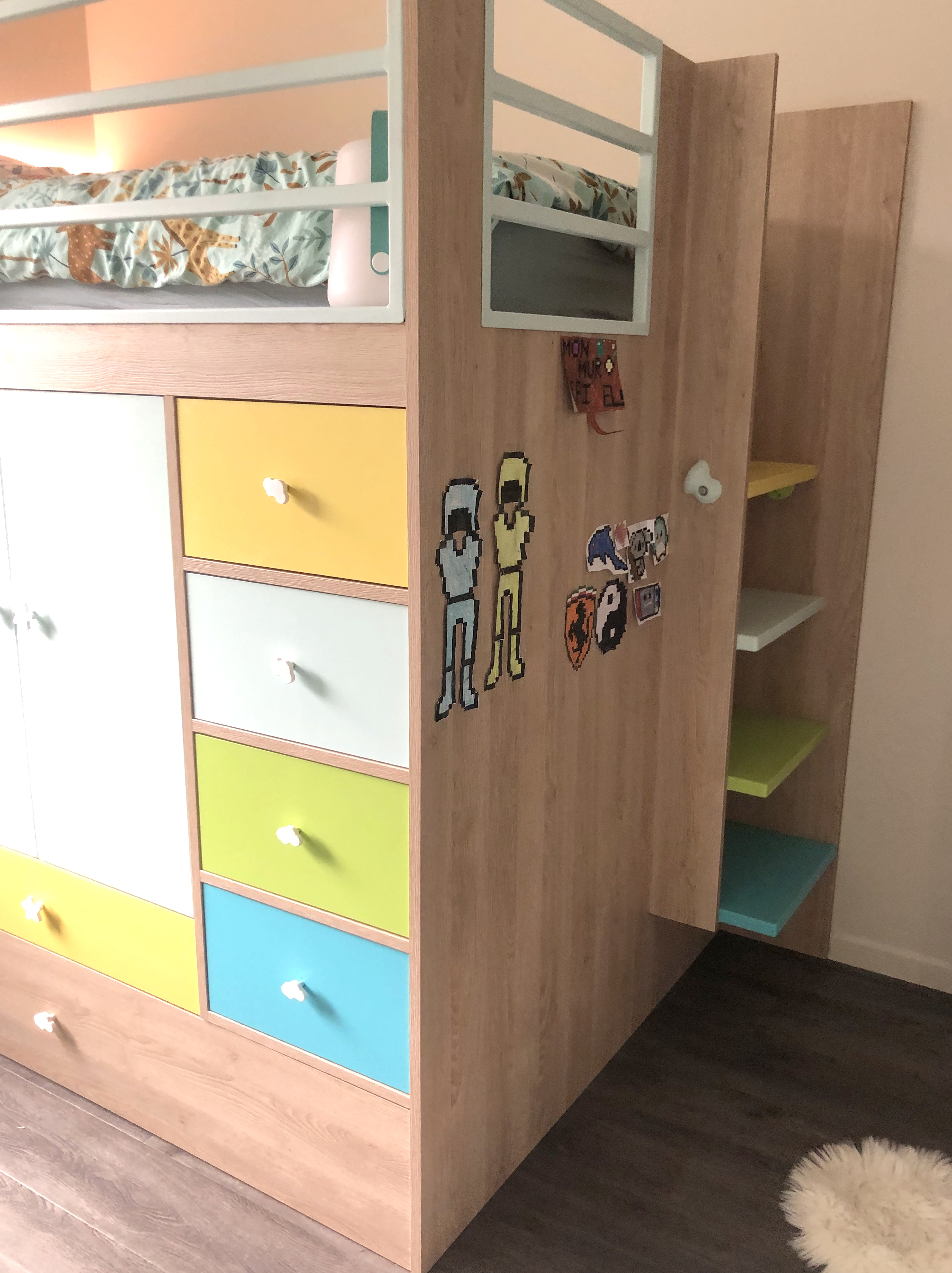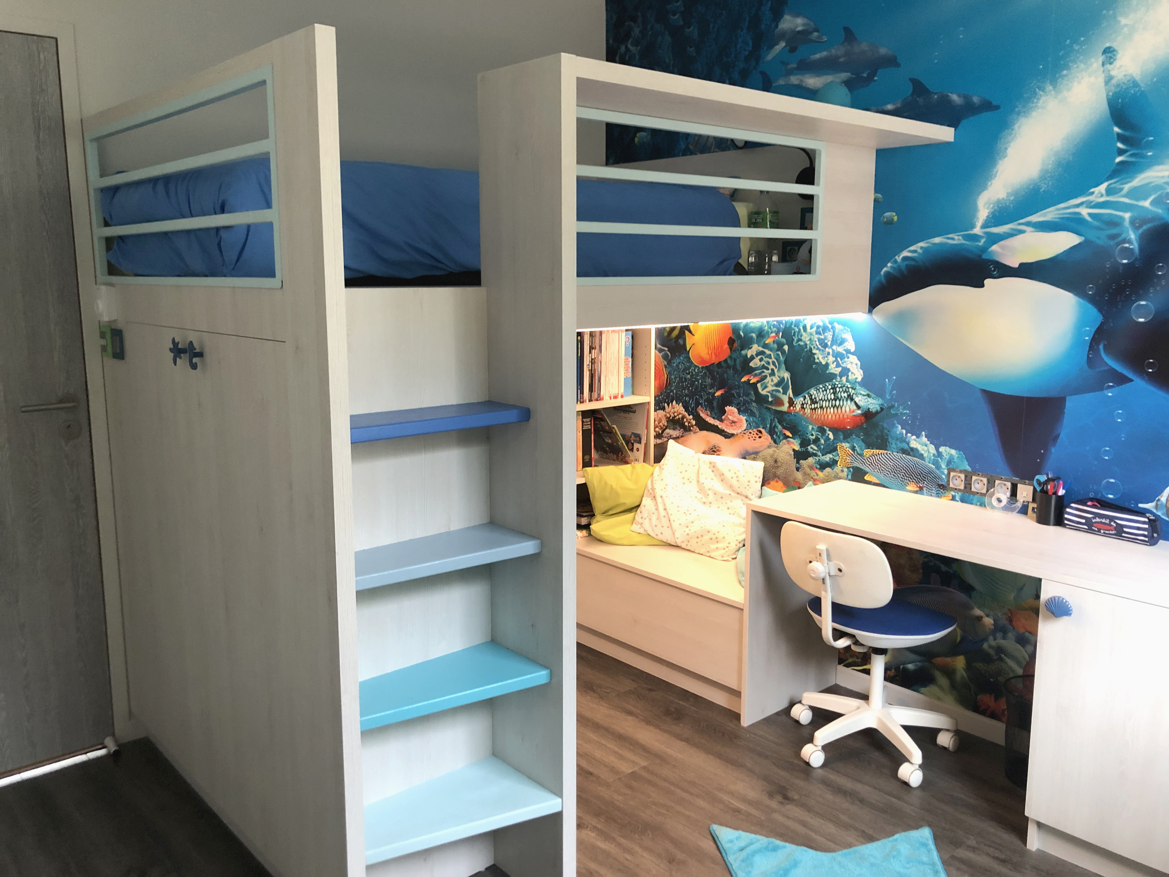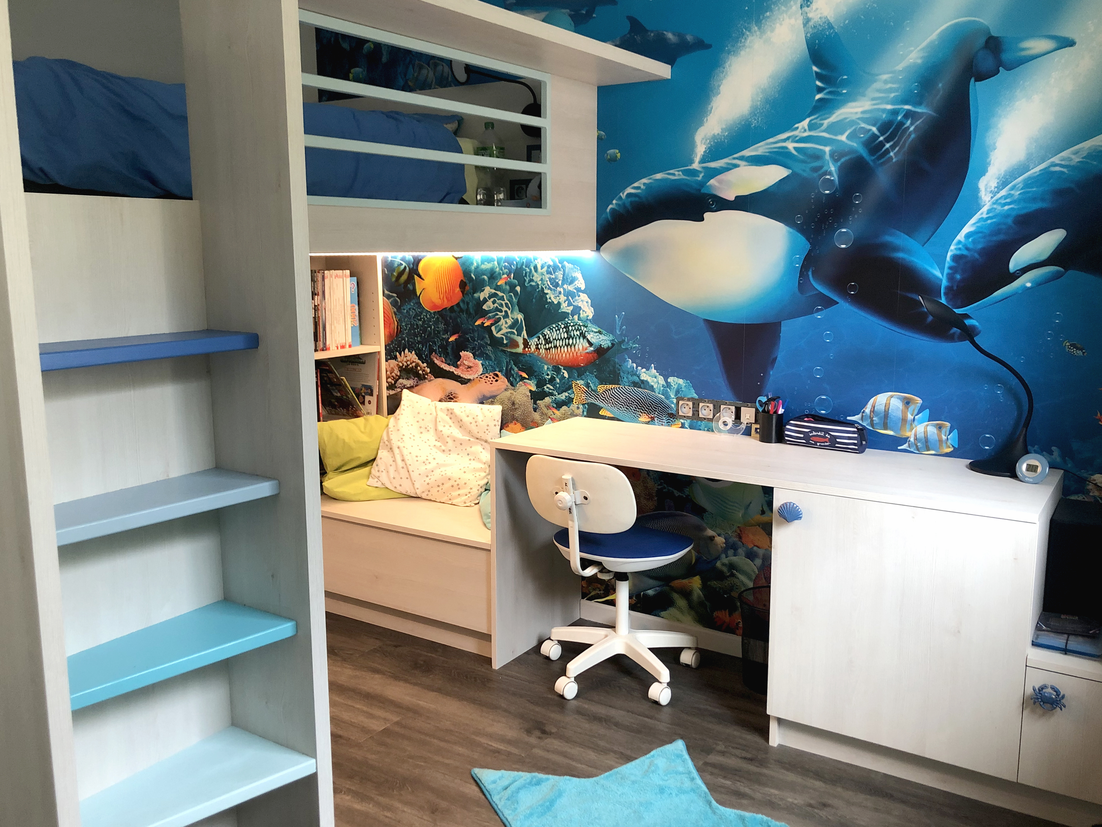 Les chambres ont été décorées avec soin pour offrir un cadre à la fois ludique et fonctionnel : des fonds marins animés dans l’une, une carte du monde colorée dans l’autre et un décor aérien avec des montgolfières pour le plus petit. Nous avons créés et réalisés sur mesure des lits surélevés avec rangements intégrés et bureau fonctionnels permettent à chacun de s’épanouir dans un cadre ludique et harmonieux. Ce projet illustre notre capacité à transformer les espaces selon les besoins évolutifs de la famille.